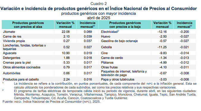 El incremento de los precios de las mercancías y de los productos agropecuarios, principalmente, aceleró la inflación general en México para ubicarse en 3.93 por ciento anual durante abril de 2025, informó el Instituto Nacional de Estadística y Geografía (Inegi). De acuerdo con el instituto, el Índice Nacional de Precios al Consumidor (INPC) del cuarto mes de 2025 mostró un alza, por tercer mes consecutivo en su medición anual, y alcanzó su mayor nivel anual desde diciembre de 2024. El INPC registró en abril una variación mensual de 0.33 por ciento, sumando dos lecturas al alza, y ligeramente superior al consenso de los analistas que esperaban una variación de 0.31 por ciento, según la última encuesta de Banamex. La inflación en 12 meses se posicionó, por cuarta lectura anual consecutiva, por debajo del rango alto del objetivo del Banco de México de estabilidad de precios de entre 3 y 4 por ciento, pero a su vez en abril sumó tres lecturas al alza. LOS QUE SUBIERON De acuerdo con el Inegi, los productos genéricos que impulsaron el alza general del índice destacaron el jitomate, con un alza mensual de 22.08 por ciento en abril; aguacate, 10.90 por ciento; carne de res, 2.10 por ciento; loncherías, fondas, torterías y taquerías, 0.52 por ciento; otros alimentos cocinados, 0.79 por ciento; vivienda propia, 0.27 por ciento; automóviles, 0.66 por ciento; productos para el cabello, 2.24 por ciento, principalmente. LOS QUE BAJARON Por el otro lado, la electricidad, por efectos estacionales, reportó una baja mensual de 12.16 por ciento, lo que representó una incidencia a la baja de 0.20 puntos porcentuales; la gasolina de bajo octanaje, 0.57 por ciento; huevo, 2.50 por ciento; carne de cerdo, 1.34 por ciento; plátanos, 4.99 por ciento; paquetes de internet, telefonía y -0.67 televisión de paga, 0.67 por ciento, entre otros. (Fotos: Tomadas de Reforma e Inegi) Compartir Navegación de entradas Iglesia debe estar cerca de los que más sufren Dos Bocas costó ¡21 mil millones de dólares!