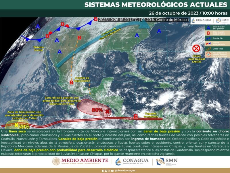 Cuando todavía no se cuantifican los brutales daños causados por el huracán Otis en Guerrero, el Servicio Meteorológico Nacional (SMN) alertó de una zona de baja presión con amplias posibilidades de convertirse en el ciclón “Pilar” en el Pacífico Sur. El organismo dependiente de la Conagua precisó que el sistema se desplaza enfrente de las costas de Guatemala y hacia las 6:00 de la mañana de este viernes se encontraba a 595 kilómetros de Chiapas. No obstante, sus desprendimientos nubosos refuerzan la posibilidad de lluvias intensas en el estado de Chiapas, “por lo que se mantiene en estrecha vigilancia”. VIGILANCIA EXTREMA Durante el sábado y domingo, la zona de baja presión con probabilidad de desarrollo ciclónico del Océano Pacífico continuará desplazándose al sur de Guatemala. Su circulación, en combinación con la vaguada monzónica que se extenderá muy próxima a las costas del Pacífico Sur Mexicano, originarán probabilidad de lluvias intensas, rachas fuertes de viento y oleaje elevado en Chiapas y Oaxaca. Durante el lunes, la zona de baja presión con probabilidad de desarrollo ciclónico del Océano Pacífico podría localizarse frente a las costas de Guatemala y Chiapas, provocando lluvias intensas en Chiapas y Oaxaca, así como rachas fuertes de viento y oleaje elevado en las costas de Oaxaca. “Pilar” y “Ramón” serían los dos siguientes ciclones de la temporada 2023 en el Océano Pacífico, de un estimado de 16 a 22. Hasta ahora, se han registrado cinco tormentas tropicales; dos huracanes categoría 1 o 2; y ocho huracanes categoría 3, 4 o 5. Compartir Navegación de entradas Guanajuato albergaría la primera planta de hidrógeno EU anticipó varias horas antes peligrosidad de Otis