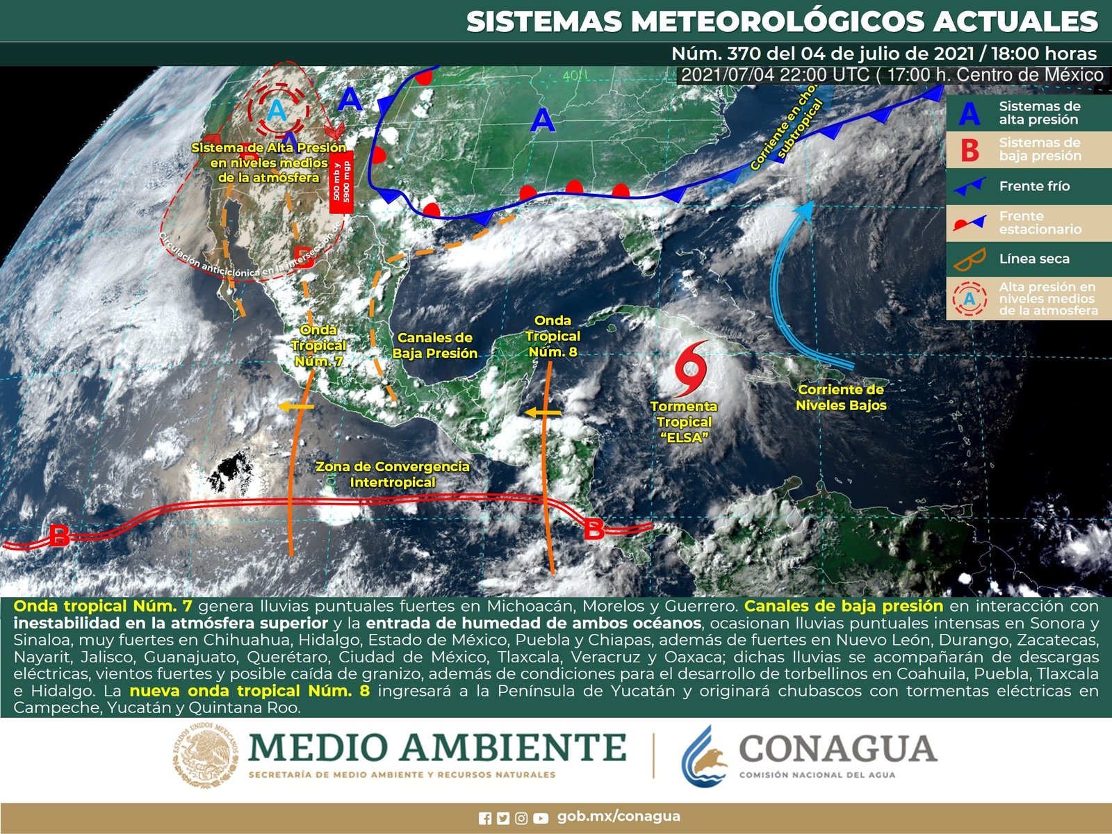 🔊 Escuchar esto Este lunes, Guanajuato continuará con alta probabilidad de lluvias nocturnas debido a la onda tropical 7, dio a conocer el Servicio Meteorológico Nacional (SMN). De acuerdo con su último reporte, el organismo dependiente de la Conagua pronostica que la Mesa Central del país registrará este lunes cielo medio nublado la mayor parte del día con lluvias puntuales muy fuertes en Guanajuato, fuertes en Puebla y Morelos, así como chubascos en Querétaro, Hidalgo y Tlaxcala. Seguirán los bancos de niebla en zonas serranas de la región, mientras que se espera viento con rachas de hasta 45 km/h en zonas de tormenta. LLUVIAS EN PARTES DE GUANAJUATO El reporte indica que Guanajuato se verá afectado por el paso de la onda tropical 7, la cual traería lluvias, principalmente nocturnas, en varios municipios del estado. Los municipios que tienen la probabilidad más alta de lluvias son León, Guanajuato capital, Silao, San Francisco del Rincón, Manuel Doblado. Todos ellos tendrán máximas de 26 grados con mínimas de 14. El resto de municipios como Celaya, Comonfort, Dolores Hidalgo, Pénjamo, Salamanca e Irapuato tienen 50 por ciento de probabilidad de lluvia. Toda la entidad tendrá hasta 84 por ciento de humedad a lo largo del día, con mínimas promedio de 14 a 15 grados en la noche y madrugada del martes. SE JUNTAN CANALES DE BAJA PRESIÓN Para el resto del país, el SMN dijo que canales de baja presión en interacción con divergencia en altura y el ingreso de humedad del Océano Pacífico y Golfo de México, continuarán generando chubascos y lluvias fuertes a muy fuertes, descargas eléctricas y posible caída de granizo sobre entidades del noroeste, norte, noreste, centro y oriente del país. PEGA ONDA TROPICAL MÁS A MICHOACÁN La onda tropical Núm. 7 se desplazará al sur las costas de Michoacán y Colima, en interacción con divergencia en altura ocasionará chubascos y lluvias puntuales muy fuertes acompañadas de descargas eléctricas y posibles granizadas sobre entidades del occidente y sur del territorio nacional. Y LLEGARÁ OTRA Onda tropical (Núm. 8) recorrerá el sureste mexicano, en interacción con un canal de baja presión sobre la Península de Yucatán, originará chubascos y lluvias fuertes acompañadas de descargas eléctricas y posibles granizadas en las mencionadas regiones, con lluvias puntuales muy fuertes en Oaxaca y Chiapas. CALORÓN EN EL SUR Prevalecerá ambiente caluroso a muy caluroso con temperaturas superiores a 40°C en zonas de Baja California y Sonora y con temperaturas de 35 a 40°C en zonas de Baja California Sur, Sinaloa, Chihuahua, Coahuila, Nuevo León, Tamaulipas, San Luis Potosí, Veracruz, Tabasco, Campeche, Yucatán y Quintana Roo. Los sistemas meteorológicos ocasionarán este lunes: Lluvias fuertes con lluvias puntuales muy fuertes (50.1 a 75.0 mm) en los estados de Chihuahua, Coahuila, Jalisco, Michoacán, Oaxaca y Chiapas. Intervalos de chubascos con lluvias puntuales fuertes (25.1 a 50.0 mm) en Sonora, Sinaloa, Durango, Nuevo León, Tamaulipas, San Luis Potosí, Zacatecas, Aguascalientes, Colima, Guanajuato, Estado de México, Puebla, Guerrero y Veracruz. Intervalos de chubascos (5.1 a 25.0 mm) en Nayarit, Querétaro, Hidalgo, Morelos, Ciudad de México, Tlaxcala, Tabasco, Campeche, Yucatán y Quintana Roo. Posible caída de granizo en Sonora, Chihuahua, Coahuila, Nuevo León, Tamaulipas, Durango, Zacatecas, Aguascalientes, Jalisco, Michoacán, Guanajuato, Querétaro, Hidalgo, Estado de México, Ciudad de México, Morelos, Tlaxcala, Puebla, Guerrero, Oaxaca y Chiapas. Posibilidad de tormentas eléctricas en Sonora, Chihuahua, Coahuila, Nuevo León, Tamaulipas, San Luis Potosí, Aguascalientes, Zacatecas, Durango, Sinaloa, Nayarit, Jalisco, Colima, Michoacán, Guanajuato, Querétaro, Hidalgo, Veracruz, Puebla, Tlaxcala, Estado de México, Ciudad de México, Morelos, Guerrero, Oaxaca, Chiapas, Tabasco, Campeche, Yucatán y Quintana Roo. Viento con rachas de 50 a 60 km/h en Chihuahua, Coahuila, Nuevo León, Tamaulipas, Campeche y Yucatán. Temperaturas máximas de 40 a 45 °C en Baja California y Sonora. Temperaturas máximas de 35 a 40 °C en Baja California Sur, Sinaloa, Chihuahua, Coahuila, Nuevo León, Tamaulipas, San Luis Potosí, Veracruz, Tabasco, Campeche, Yucatán y Quintana Roo. Temperaturas mínimas para la madrugada del martes de 0 a 5 °C y posibles heladas en zonas montañosas del Estado de México. Compartir