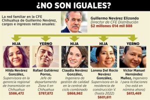 Dicen una y otra vez que “se acabó la corrupción”, que “no son como los de antes”, pero en los hechos poco ha cambiado. El diario Reforma reveló cómo Guillermo Nevárez Elizondo, director general de la subsidiaria CFE Distribución, mantiene una red de nepotismo en el estado de Chihuahua. El rotativo documentó que este alto directivo tiene a sus tres hijas y a un yerno dentro de la nómina de la empresa estatal en gerencias regionales del estado con sueldos millonarios. SE REGALAN CARGOS Hilda Denisse Nevárez González, una de las hijas del directivo, es supervisora administrativa de calidad y control de gestión en la gerencia regional de Transmisión Norte, zona de operación Chihuahua. Sus ingresos netos anuales como trabajadora de CFE, entre salarios, bonos, aguinaldo y otras prestaciones asciende a 586 mil 472 pesos, según lo reportó en su declaración patrimonial. Su esposo, Rafael Gutiérrez Porras, es jefe de departamento Zona ll en la misma entidad y está encargado de la red eléctrica de subtransmisión, con un ingreso neto anual de 787 mil 872 pesos. CON SUELDAZOS Otra de sus hijas, Lorena Del Rocío Nevárez González, es supervisora del programa de capacitación en la residencia general de construcción V, Chihuahua, y su ingreso mensual hasta 2022 fue de 601 mil 611 pesos. Hasta el año pasado, su esposo Víctor Manuel Hernández Muñoz, era ingeniero para la supervisión de elaboración e integración de paquetes de licitaciones, también en Chihuahua, y percibía un ingreso anual neto de 613 mil 469 pesos. Actualmente, ya no aparece en la nómina transparente del Gobierno federal. Finalmente, su hija Claudia Imelda Nevárez González, opera como ingeniera de sistema de gestión de calidad en la central de ciclo combinado Chihuahua; su remuneración neta anual es de 868 mil 982 pesos. OCULTAN CONTRATOS En el caso de su marido, José Luis Peinado, no labora dentro de la CFE, pero es fundador y CEO de Grupo Ditelli, que integra cuatro empresas que brindan servicios de infraestructura de telecomunicaciones y de redes para instalaciones eléctricas, gas natural, agua y fibra óptica, y que según su sitio web han trabajado para la CFE, aunque los contratos entre ambas empresas no son públicos. EL CABECILLA Desde 1980, Guillermo Nevárez tiene registro de relación laboral con la CFE y desde el inicio de la presente administración es director de Distribución. El ingreso neto de Nevárez, según su declaración patrimonial, fue de 2 millones 14 mil 888 pesos. (Fotos y gráfico: Tomados del diario Reforma) Compartir