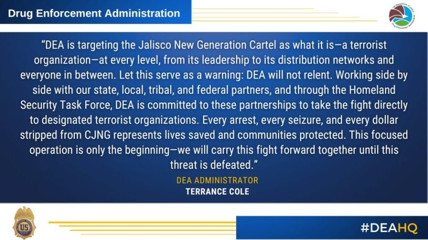 “La DEA está atacando al Cártel Jalisco Nueva Generación (CJNG) como lo que es: una organización terrorista, en todos los niveles, desde su liderazgo hasta sus redes de distribución y todos aquellos que están en el medio”, dijo Terry Cole, titular de la DEA.