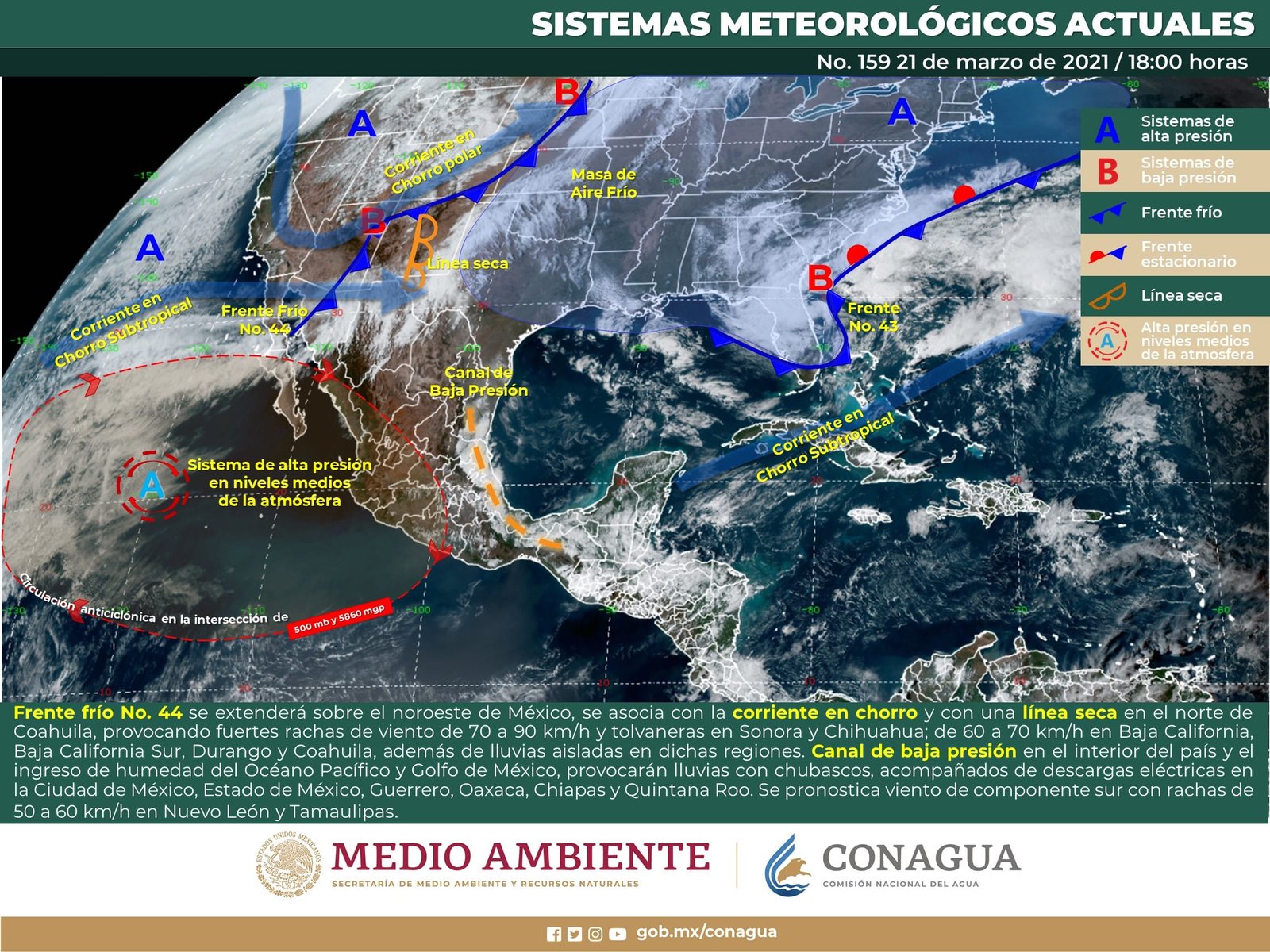 🔊 Escuchar esto Guanajuato tendrá este lunes temperaturas máximas hasta de 32 grados con muy baja probabilidad de lluvia, dio a conocer el Servicio Meteorológico Nacional (SMN). De acuerdo con su último reporte, el organismo de la Comisión Nacional del Agua (Conagua) pronostica que para la Mesa Central del país se espera cielo despejado por la mañana e incremento de nublados hacia la tarde, con lluvias aisladas solo en Puebla. El ambiente tampoco tendrá muchos cambios, pues se espera de frío a fresco al amanecer en zonas montañosas y cálido durante el día. Se espera viento con rachas de 30 a 40 km/h. FRÍO NOCTURNO EN GUANAJUATO El reporte indica que Guanajuato proseguirá con cielos despejados durante la mayor parte del día con máximas promedio de 30 grados. No obstante, municipio como Irapuato, Salamanca y Celaya tendrán máximas hasta de 32 grados con baja probabilidad de lluvias. El resto de municipios como León, Guanajuato capital, Pénjamo, Comonfort, Manuel Doblado y Dolores Hidalgo tendrán entre 29 y 30 grados de máxima y apenas 15 por ciento de probabilidad de lluvia. Las mínimas en todo el territorio guanajuatense oscilarán entre los 6 y 7 grados, por lo que se espera frío en la noche y madrugada del martes. VIENTO Y TOLVANERAS EN EL NORTE Para el resto del país, el SMN dijo que el frente frío No. 44 se extenderá sobre el norte del territorio nacional. Este fenómeno se asociará con la corriente en chorro subtropical y con la corriente en chorro polar provocando rachas de viento fuertes a intensas con tolvaneras en el noroeste y norte de México, con velocidades entre 80 y 100 km/h en Chihuahua, Durango y Coahuila. LLUVIAS EN EL ORIENTE Un canal de baja presión en el oriente del país y el ingreso de humedad del Golfo de México provocarán lluvias e intervalos de chubascos en el oriente y sureste de la República Mexicana. SIGUE CALORÓN EN EL CENTRO La circulación anticiclónica en niveles medios de la atmósfera favorecerá ambiente caluroso a muy caluroso sobre los estados del occidente, norte, noreste, oriente, centro, sur y sureste del país, incluida la Península de Yucatán, con temperaturas máximas de 40 a 45 °C en Michoacán y Guerrero. Los sistemas meteorológicos ocasionarán este lunes: Intervalos de chubascos (5.1 a 25.0 mm) en los estados Chiapas y Quintana Roo (sur). Lluvias aisladas (0.1 a 5.0 mm) en Coahuila, Puebla, Veracruz, Oaxaca y Campeche. Viento con rachas de 80 a 100 km/h y tolvaneras en Chihuahua, Durango y Coahuila. Viento con rachas de 60 a 80 km/h y tolvaneras en Sonora, Nuevo León, Zacatecas y San Luis Potosí. Viento de componente sur (surada) con rachas de 60 a 80 km/h y tolvaneras en Tamaulipas y Veracruz. Viento con rachas de 50 a 60 km/h en Golfo de California, Baja California, Baja California Sur, Sinaloa, Aguascalientes, Jalisco, Campeche y Yucatán. Temperaturas máximas de 40 a 45 °C en Michoacán y Guerrero. Temperaturas máximas de 35 a 40 °C en Durango (noreste), Coahuila, Nuevo León, San Luis Potosí, Sinaloa, Nayarit, Jalisco, Colima, Estado de México (suroeste), Morelos, Puebla (suroeste), Oaxaca, Chiapas, Campeche y Yucatán. Temperaturas mínimas para la madrugada del martes de -10 a -5 °C con heladas en las zonas montañosas de Chihuahua y Durango. Temperaturas mínimas para la madrugada del martes de -5 a 0 °C con heladas en zonas montañosas de Baja California, Sonora y Zacatecas. Temperaturas mínimas para la madrugada del martes de 0 a 5 °C y posibles heladas en zonas montañosas de Coahuila, Aguascalientes, Jalisco, Michoacán, Guanajuato, Estado de México y Puebla. Compartir