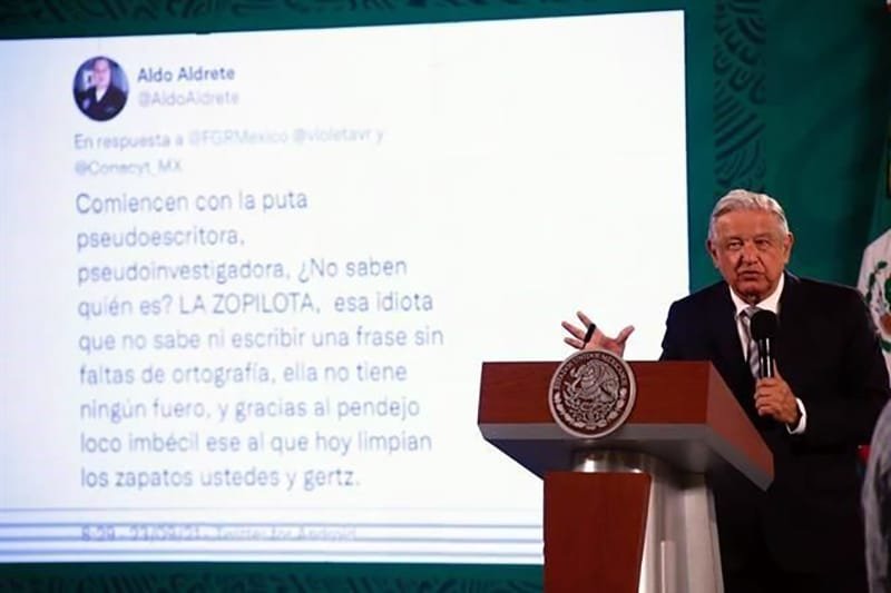 🔊 Escuchar esto El pleito parece personal. En su conferencia mañanera de este viernes, el presidente Andrés Manuel López Obrador arremetió contra un presunto científico de los 31 del Conacyt denunciados por desvío de recursos. El mandatario exhibió un mensaje escrito en la red social Twitter en el cual una persona identificada como Aldo Aldrete y quien sería uno de los 31 científicos perseguidos por la Fiscalía General de la República (FGR) en el que insulta al presidente y a su esposa, Beatriz Gutiérrez Müller. Sin embargo, el diario AnimalPolítico verificó que ese nombre no está en la lista de los 31 ex funcionarios denunciados. “Ofende a Beatriz y me ofende a mí, ¿qué tenemos que ver nosotros? Es producto de todo un proceso de deformaciones que se fueron creado durante el periodo neoliberal, cuando hablo de que fue peor esto que el porfiriato, puedo probarlo”, dijo molesto el tabasqueño. Se llama el señor, si es real, Aldo Aldrete. ‘Comiencen con la puta pseudoescritora, pseudoinvestigadora, ¿no saben quién es? La zopilota, esa idiota que no sabe ni escribir una frase sin faltas de ortografía, ella no tiene ningún fuero y gracias al pendejo, loco, imbécil, ese al que hoy limpian los zapatos ustedes y Gertz’”, leyó el mandatario en su mañanera. Tras dar lectura, dijo que, “como siempre hemos salido de la calumnia ilesos y tenemos tranquilidad en nuestra consciencia lo podemos poner (el tuit)”. TODO VIENE DEL PASADO “Esto es para que entre todos analicemos el grado de descomposición al que nos llevaron con la política de pillaje, de corrupción, en donde lo más importante era triunfar a toda costa sin escrúpulos morales (…) Por eso mi discurso del 16 de septiembre lo dediqué en buena parte a dar a conocer los insultos de la oligarquía contra Hidalgo”, justificó. El pasado 20 de septiembre, el periodista Raymundo Riva Palacio, columnista de El Financiero, dio a conocer en Estrictamente Personal que Alejandro Gertz Manero solicitó una orden de aprehensión contra 31 miembros del Conacyt, entre estos, investigadores, científicos y personal administrativo, acusados de operaciones con recursos de procedencia ilícita y delincuencia organizada y peculado. El mismo diario recordó que el caso no ha procedido tras la determinación de un juez federal del Centro de Justicia Penal Federal El Altiplano, quien se negó a procesar las solicitudes de aprehensión contra los 31 científicos del Conacyt, sin embargo, autoridades federales confirmaron a este diario que la decisión aún puede ser impugnada por la dependencia federal que encabeza Alejandro Gertz Manero. QUE SE CASTIGUE López Obrador pidió más adelante que se investigue y castigue a los investigadores corruptos. Que se investigue y que si hay corrupción que se castigue, por qué nada más se va castigar a los pobres, a los que no tienen con qué comprar su inocencia, que no tienen agarraderas, que no son influyentes, se tiene que acabar la impunidad”, señaló. El tabasqueño acusó que anteriormente investigadores del Conacyt no hacían nada y solamente gastaban. “Tenían una asociación civil un grupo de investigadores y se iban a congresos y se les tenía que pagar del presupuesto hasta para sus lujos. Y como tenían mucha influencia, pues este y buenas agarraderas y buenas relaciones con los medios y con la intelectualidad orgánica del régimen, era una especie de chantaje y se les tenían que entregar estos fondos”, acusó. “Y cuando ya desaparece eso, que ya no hay esas extravagancias, esos lujos, el derroche, pues entonces se informaban y se quejan de que no se invierte en la ciencia, que no nos importa la innovación tecnológica”. Compartir