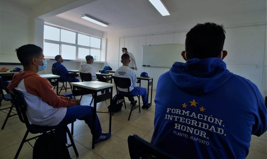 🔊 Escuchar esto Los Bachilleratos Bivalentes Militarizados de León e Irapuato regresaron a las aulas presenciales cumpliendo las estrictas medidas sanitarias dictadas por la Secretaría de Salud de Guanajuato (SSG). Los planteles educativos -dos en León y uno en Irapuato- se acogieron al Plan Piloto del Regreso a las Aulas contemplado por la Secretaría de Educación estatal (SEG). En León, más de 400 alumnos y alumnas regresaron a las aulas en los planteles de las colonias 10 de mayo y Las Joyas. Ahí, a fin de asegurar un contexto seguro, las clases se impartirán en tres turnos, de tres horas cada uno. Cada grupo se presentará en las instalaciones de los Bachilleratos Bivalentes Militarizados dos veces a la semana, con un aforo máximo de 15 personas por turno. Se habilitó el quinto día hábil para regularización de alumnas o alumnos que así requieran. FILTROS OBLIGADOS Como parte de los protocolos sanitarios las personas de la comunidad educativa deben cumplir con cuatros filtros: El primero se efectúa en casa, consistente en la revisión de la presencia de algunos de síntomas de probable caso de Covid-19, y en caso de que presenten algún síntoma, deberán abstenerse de acudir a clases. El segundo filtro se hace a la entrada del plantel, en el cual se toma temperatura, se asegura el lavado de manos. El tercero filtro consiste en la aplicación de las referidas medidas, pero ahora durante el desarrollo de las actividades escolares. En el cuarto filtro se limpian superficies y asegura el lavado de manos antes de retirarse de las instalaciones. En cuanto a las medidas de sana distancia, durante esta etapa de la prueba se mantienen clausuradas las canchas deportivas, así como bebederos y el área de comedor. El mayor Alfonso Huerta Escoto, encargado de despacho del Bachillerato Bivalente Militarizado I, señaló que las y los jóvenes pedían el regreso a clases presenciales, pues la interacción personal es lo ideal para el desarrollo de sus conocimientos. EN IRAPUATO VUELVEN 30 En Irapuato, un total de 30 alumnos, así como 15 docentes y 11 empleados administrativos volvieron a las clases presenciales. El Bachillerato Bivalente Militarizado de ese municipio inició actividades con 15 alumnos de cada grupo de 5to. semestre y 15 alumnos por cada grupo del 2do. semestre. Mayra Guadalupe Salas Hernández, alumna del 5to. semestre, destacó la importancia del regreso a las clases presenciales. “Aún y cuando este es un plan piloto, debemos aplicarnos como alumnos y cumplir con nuestra responsabilidad dentro y fuera de la institución, es un gusto volver a las aulas”, comentó la sargento 2do. de cadetes. El plan piloto de regreso a la escuela, es un ejercicio voluntario, que se lleva a cabo en coordinación con la Secretaría de Salud y que tiene el objetivo de verificar la definición, adaptación y aplicación de los protocolos establecidos para evitar el contagio o propagación del Covid-19 en los centros educativos de Guanajuato. Compartir