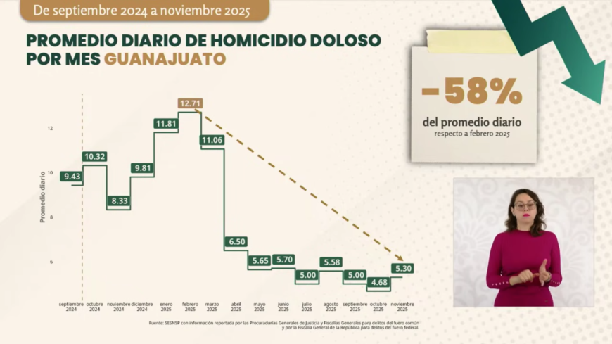 Figueroa indicó que, durante los últimos 14 meses, Guanajuato pasó de 12.7 homicidios diarios a 5.3 en noviembre.
