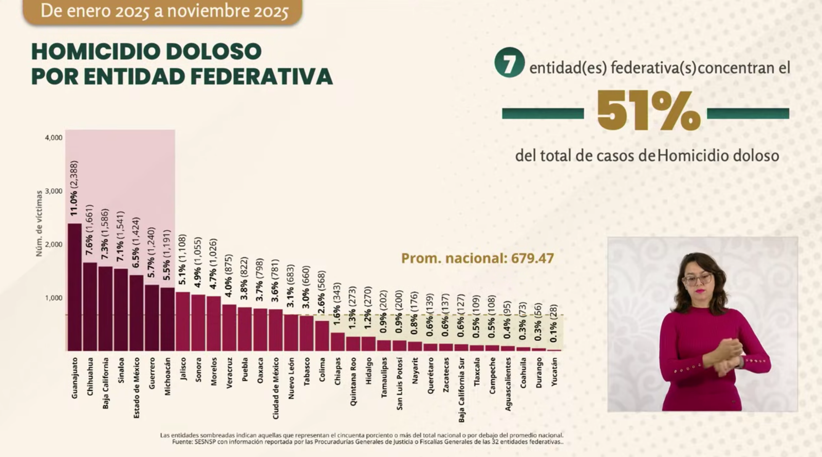 En el reporte hasta el 30 de noviembre se tiene una disminución de 37 por ciento en los homicidios dolosos diarios a nivel nacional, lo que equivale a 32 menos por día respecto a septiembre de 2024.