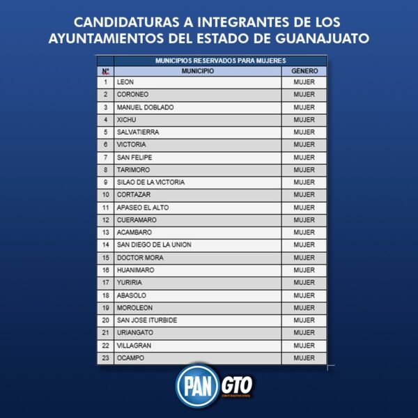 Así lo aprobó el Consejo Estatal del Partido Acción Nacional al definir el género de las candidaturas a los diferentes municipios de Guanajuato para el proceso electoral del 2024.