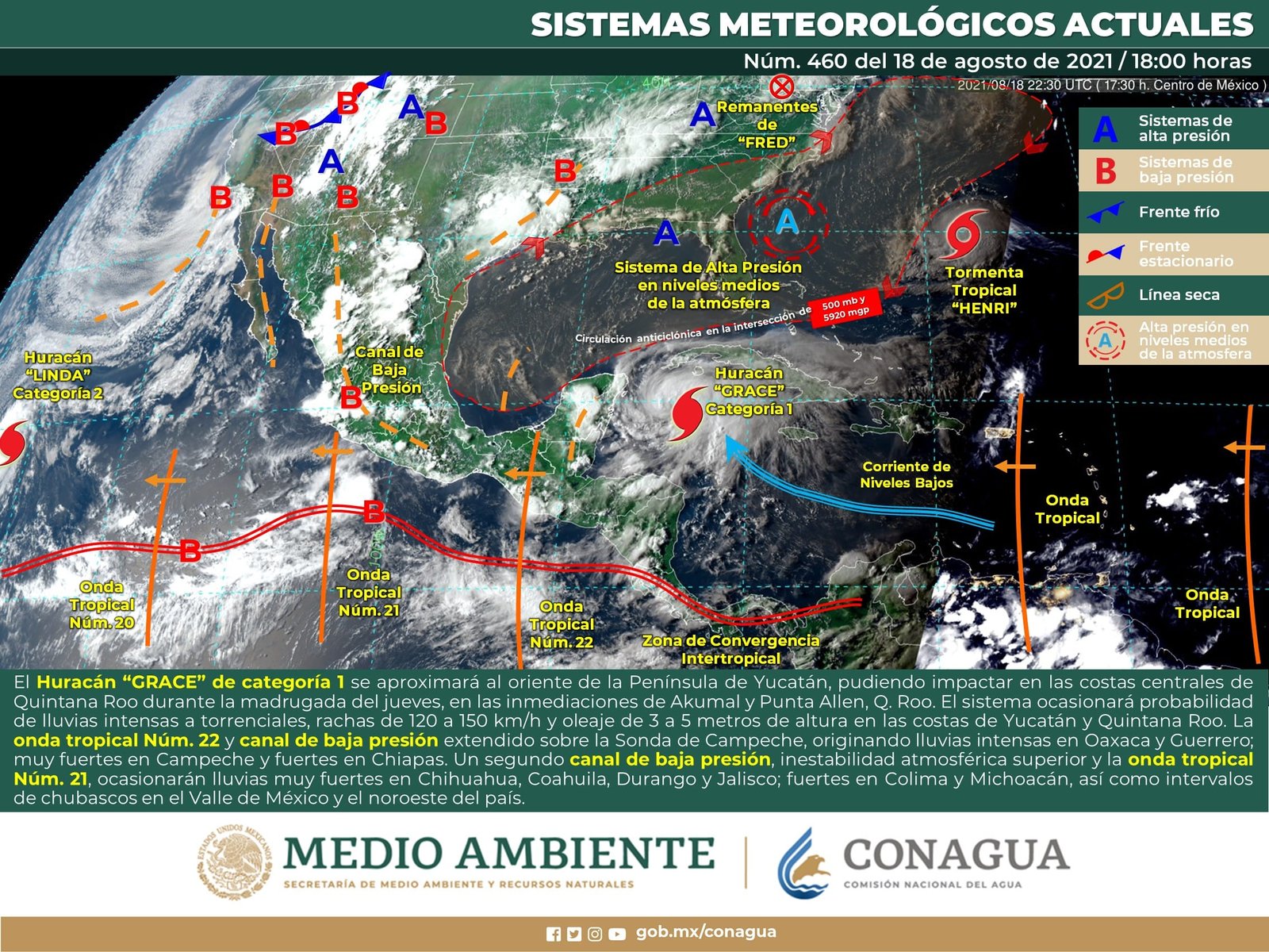 🔊 Escuchar esto Este jueves, las probabilidades de lluvia en Guanajuato bajarán a 20-25 por ciento, con temperaturas máximas promedio de 27 grados, dio a conocer el Servicio Meteorológico Nacional (SMN). De acuerdo con su último reporte, el organismo dependiente de la Conagua pronostica que la Mesa Central del país tendrá cielo medio nublado por la mañana y nublado por la tarde con intervalos de chubascos en Puebla y Morelos, así como lluvias aisladas en Guanajuato, Querétaro, Hidalgo y Tlaxcala. Seguirá el ambiente frío a fresco al amanecer y cálido por la tarde, mientras que el viento del norte y noreste de 10 a 25 km/h estará acompañado con rachas de hasta 50 km/h. ALTA HUMEDAD EN GUANAJUATO El reporte indica que Guanajuato verá reducidas las probabilidades de lluvia, aunque municipios como Pénjamo tienen 60 por ciento durante la noche. La mayor parte del estado tendrá máximas promedio de 27 y 28 grados con elevada humedad a lo largo del día. Los municipios de León, Guanajuato capital, Dolores Hidalgo, Comonfort, San Miguel de Allende, Celaya, Salamanca e Irapuato tienen probabilidad de 20-30 por ciento de lluvia nocturna. Las temperaturas mínimas en el estado oscilarán entre los 12 y 14 grados durante la noche y madrugada del viernes. PEGA HURACÁN “GRACE” Para el resto del país, el SMN dijo que el centro del Ciclón Tropical “Grace” impactará en la costa central de Quintana Roo como posible Huracán categoría 1, en las inmediaciones de Akumal y Punta Allen, QRoo., cruzando la Península de Yucatán en el transcurso de la tarde como una tormenta tropical e ingresando en el Golfo de México por la noche. En su recorrido, el sistema ocasionará probabilidad de lluvias intensas a torrenciales, rachas intensas de viento y oleaje elevado en Campeche, Yucatán y Quintana Roo. Y ONDA TROPICAL EN EL SUR Por otra parte, la onda tropical 22 recorrerá el sureste del territorio nacional, interaccionará con el ingreso de humedad del Golfo de México y Mar Caribe originado por la circulación de “Grace”, provocando lluvias fuertes a puntuales intensas con descargas eléctricas sobre dicha región. CANAL DE BAJA PRESIÓN EN EL CENTRO Asimismo, un canal de baja presión extendido sobre la Mesa del Norte y la Mesa Central y divergencia en altura, propiciarán chubascos y lluvias fuertes a muy fuertes acompañadas de descargas eléctricas y posible caída de granizo sobre entidades del noroeste, norte, occidente, centro y sur del país. Los sistemas meteorológicos ocasionarán este jueves: Lluvias intensas con lluvias puntuales torrenciales (150.1 a 250.0 mm) en los estados de Campeche, Yucatán y Quintana Roo. Lluvias muy fuertes con lluvias puntuales intensas (75.1 a 150.0 mm) en Oaxaca y Chiapas. Lluvias fuertes con lluvias puntuales muy fuertes (50.1 a 75.0 mm) en Chihuahua, Coahuila, Durango, Guerrero y Tabasco. Intervalos de chubascos con lluvias puntuales fuertes (25.1 a 50.0 mm) en Jalisco, Michoacán y Veracruz. Intervalos de chubascos (5.1 a 25.0 mm) en Sinaloa, Nayarit, Colima, Nuevo León, Tamaulipas, San Luis Potosí, Zacatecas, Estado de México, Ciudad de México, Morelos y Puebla. Lluvias aisladas (0.1 a 5.0 mm) en Sonora, Guanajuato, Querétaro, Hidalgo y Tlaxcala. Posible caída de granizo en Chihuahua, Coahuila, Durango, Sinaloa, Jalisco, Chiapas, Campeche, Yucatán y Quintana Roo. Viento con rachas de 100 a 120 km/h y oleaje de 3 a 5 metros de altura en costas de Campeche y Yucatán, y con rachas de 80 a 100 km/h y oleaje de 2 a 3 metros de altura en costas de Quintana Roo. Viento con rachas de 50 a 60 km/h en Baja California, Sonora, Coahuila, Nuevo León, Tamaulipas, San Luis Potosí, Zacatecas y Durango. Temperaturas máximas de 40 a 45 °C en Nuevo León y Tamaulipas. Temperaturas máximas de 35 a 40 °C en Baja California Sur, Baja California, Sonora, Sinaloa, Coahuila, San Luis Potosí (oriente), Veracruz (norte) y Tabasco. Temperaturas mínimas para la madrugada del viernes de 0 a 5 °C y posibles heladas en zonas montañosas de Estado de México, Hidalgo, Tlaxcala y Puebla. Compartir