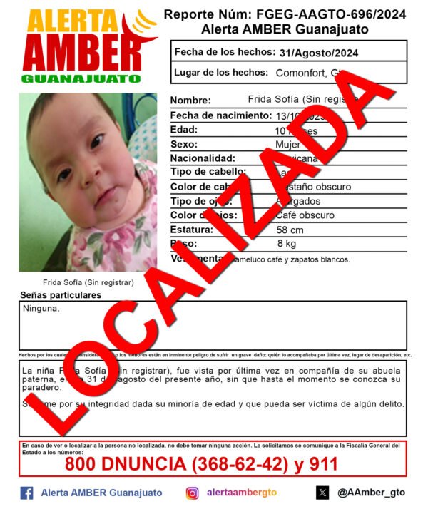 Una bebé de 10 meses originaria del municipio de Comonfort, Guanajuato, fue localizada en el estado de Puebla luego de que se activara el Protocolo Amber y mecanismos de búsqueda a nivel nacional. La Fiscalía General del Estado de Guanajuato (FGEG), a través de su Unidad Especializada en la Investigación de Personas Desaparecidas, activó los protocolos de búsqueda y dispuso de las herramientas para dar con Frida Sofía de 10 meses que desapareció en el mencionado municipio guanajuatense. Luego de que se recibiera la denuncia por la desaparición, ocurrida el 31 de agosto, se inició una carpeta de investigación y se activó de inmediato el Protocolo Amber el 4 de septiembre. INTENSA BÚSQUEDA La Agencia de Investigación Criminal realizó trabajos de campo, recabó información del lugar donde fue vista por última vez y acopió testimonios que pudieran aportar información sustancial. Además, se consultaron diversas bases de datos y se emitieron solicitudes de búsqueda, lo que llevó a ubicar a la menor en el municipio de Izúcar Matamoros, Puebla. Esta información resultó de base para que el Agente del Ministerio Público entablara colaboración con autoridades de aquella entidad, a quienes se les proporcionó información sobre su posible localización, logrando con ello su resguardo. Agentes Investigadores y personal de psicología se trasladaron a Puebla, donde valoraron el estado de salud de la niña para traerla de regreso y reintegrarla a su núcleo familiar, a su familia en todo momento se les mantuvo en comunicación sobre las acciones implementadas por la Fiscalía de Guanajuato. Compartir Navegación de entradas El Museo Casa Diego Rivera echa la casa por la ventana Nombra Sheinbaum a titulares de Infonavit, Profeco, Conade…