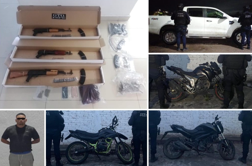 Un presunto sicario de alta peligrosidad fue detenido por fuerzas de seguridad estatales en el municipio de Celaya. La Secretaría de Seguridad Pública del Estado reportó que, en coordinación con la Fiscalía General del Estado de Guanajuato (FGEG), detuvo a un sujeto originario de Piedras Negras, Coahuila, en posesión de armas largas, cargadores, más de un centenar de cartuchos útiles, estrellas ponchallantas y vehículos. El hecho se registró cuando los efectivos estatales hacían recorridos en San José de Guanajuato, zona considerada como de incidencia delictiva. El sujeto, identificado como Ricardo “N”, de 27 años, tenía en su poder, además, dosis de droga, y vehículos con reporte de robo. TODA UNA FICHA Al presunto sicario se le aseguraron: 3 armas de fuego largas, calibre .762 123 cartuchos calibre .762 8 cargadores para arma larga Una Ford Ranger, 2017, pick Up, con reporte de robo en Irapuato Motocicleta Italika, tipo Cross, modelo 200 cc, color negro/verde, con reporte de robo en Celaya Motocicleta Italika, sin reporte de robo Motocicleta Pulsar, versión dominar 400, modelo 2020, color gris/negro, sin reporte de robo 25 estrellas ponchallantas 2 equipos de telefonía celular 1 mochila 2 dosis de marihuana. Tras lo ocurrido, el sujeto como todo lo decomisado fueron puestos a disposición de la autoridad competente. Compartir