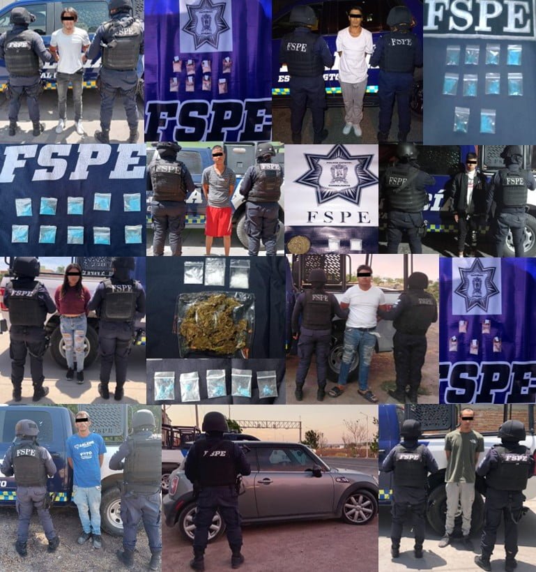 Ocho presuntos narcomenudistas fueron detenidos por elementos de las Fuerzas de Seguridad Pública del Estado (FSPE) en siete municipios de Guanajuato. La detención de estos sujetos se dio luego de que la mayoría alterara el orden público y se les descubriera en posesión de diversas dosis de drogas. El reporte de Seguridad Pública indica que en el municipio de Acámbaro detuvieron a un sujeto en la colonia Rancho Grande, donde alteraba el orden público, por lo que fue sometido a una inspección en la que se localizaron nueve dosis de la droga cristal. El sujeto dijo llamarse Alexis “N”, de 31 años de edad. En otro hecho, en Dolores Hidalgo, los uniformados detuvieron a un sujeto que se intoxicaba en la colonia Chapalita y tenía también casi 10 dosis de cristal. Fue identificado como Daniel “N” de 24 años de edad. CRISTAL, LA DROGA MÁS COMÚN En Cortazar, elementos de las FSPE que patrullaban la colonia Felipe Carrillo Puerto detuvieron a otro sujeto que se estaba intoxicando en la vía púbica. Ángel “N”, de 29 años, tenía también 10 dosis de cristal. Mientras tanto en Juventino Rosas, sobre la calle Emiliano Zapata, elementos detuvieron a Daniel “N”, de 24 años, quien estaba alterando el orden público y, tras una revisión, se le encontraron también 10 dosis de cristal. Además, este sujeto iba en un BMW, Mini Copper, gris, sin registro en el sistema. En San Luis de la Paz, en la comunidad Misión de Chichimecas, uniformados de las FSPE detuvieron a Yair “N”, quien se intoxicaba en la vía pública. Tras la inspección se le hallaron cuatro dosis de cristal y 19 de marihuana. ESCANDALOSOS SIN RESPETO En León, en la colonia Piletas se detuvo a Sergio “N”, de24 años, quien estaba alterando el orden público. Tras la inspección se le encontraron tres dosis de cristal y ocho de marihuana. En San José Iturbide, al hacer un rondín en la colonia Lomas de Buena Vista, elementos detectaron a un sujeto que hacía necesidades fisiológicas en la vía pública. Tras la inspección, a Mario “N”, de 30 años, le hallaron 18 dosis de cristal. En el mismo municipio, pero en la colonia Loma Taurina detuvieron a una mujer que escandalizaba en la vía pública. A Luz “N”, de 20 años, le hallaron 12 dosis de cristal. En todos los casos tanto las personas, las drogas y el vehículo, quedaron asegurados y a disposición de la autoridad competente. Compartir Navegación de entradas Ven en Guanajuato aumento de tendencias suicidas entre jóvenes Muestra Fiscalía a 2 de los presuntos autores del multihomicidio