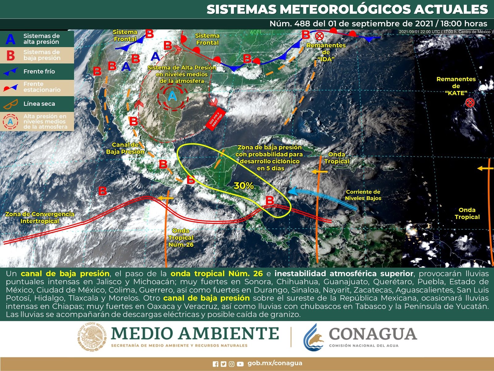 🔊 Escuchar esto Este jueves, Guanajuato continuará con tiempo lluvioso debido a la presencia de un canal de baja presión y a la onda tropical 26, dio a conocer el Servicio Meteorológico Nacional (SMN). De acuerdo con su último reporte, el organismo dependiente de la Comisión Nacional del Agua (Conagua) pronostica que la Mesa Central del país tendrá cielo nublado durante el día; por la mañana bancos de niebla en zonas altas de la región y por la tarde, probabilidad de lluvias puntuales muy fuertes en Guanajuato, Querétaro e Hidalgo, así como fuertes en Morelos, Tlaxcala y Puebla. Continuará el ambiente fresco durante la mañana y cálido por la tarde, mientras que el viento de dirección variable de 15 a 30 km/h traerá rachas de hasta 40 km/h. TORMENTAS NOCTURNAS EN GUANAJUATO El pronóstico indica que Guanajuato seguirá con tiempo lluvioso, principalmente durante la noche con tormentas. La probabilidad de lluvia en la entidad oscilará desde el 70 hasta el 90 por ciento con lluvias moderadas a fuertes, principalmente en los municipios del corredor industrial. Las temperaturas máximas promedio en el estado serán de 23 grados durante el día con mínimas de 14 grados, con excepto de los municipios del noreste que tendrán de 11 a 12 grados durante la noche y madrugada del viernes. LLUVIAS EN EL OCCIDENTE Para el resto del país, el SMN dijo que un canal de baja presión se extenderá sobre la Mesa del Norte y la Mesa Central. Este fenómeno interaccionará con la onda tropical 26 que se desplazará por el occidente del territorio nacional y con inestabilidad atmosférica superior producirá lluvias fuertes a muy fuertes acompañadas de descargas eléctricas y posible caída de granizo en estados del noroeste, occidente, centro y sur de México, con tormentas puntuales intensas en Nayarit, Jalisco y Michoacán. CANAL DE BAJA PRESIÓN EN EL GOLFO Asimismo, otro canal de baja presión en el sureste del país y la entrada de humedad del Golfo de México ocasionarán probabilidad de chubascos y lluvias fuertes a muy fuertes en dichas regiones, además de lluvias puntuales intensas en Oaxaca y Chiapas. Se mantendrá el ambiente caluroso a muy caluroso sobre entidades del noroeste, norte, noreste y sureste de México, así como en la Península de Yucatán. Los sistemas meteorológicos ocasionarán este jueves: Lluvias muy fuertes con lluvias puntuales intensas (75 a 150 mm) en los estados de Nayarit, Jalisco, Michoacán, Oaxaca y Chiapas. Lluvias fuertes con lluvias puntuales muy fuertes (50 a 75 mm) en Chihuahua, Durango, Sinaloa, Colima, San Luis Potosí, Guanajuato, Querétaro, Hidalgo y Guerrero. Intervalos de chubascos con lluvias puntuales fuertes (25 a 50 mm) en Sonora, Zacatecas, Estado de México, Ciudad de México, Morelos, Tlaxcala, Puebla y Veracruz. Intervalos de chubascos (5 a 25 mm) en Coahuila, Nuevo León, Tamaulipas, Aguascalientes y Tabasco. Lluvias aisladas (0.1 a 5 mm) en Baja California Sur, Campeche y Quintana Roo. Posible caída de granizo en Chihuahua, Sinaloa, Durango, Zacatecas, San Luis Potosí, Veracruz, Puebla, Tlaxcala, Hidalgo, Querétaro, Guanajuato, Jalisco, Colima, Michoacán, Estado de México, Ciudad de México, Morelos, Guerrero y Oaxaca. Viento con rachas de 50 a 60 km/h en Baja California Sur, Chihuahua, Coahuila, Nuevo León, Tamaulipas, Durango, Zacatecas, San Luis Potosí, Campeche, Yucatán y Quintana Roo. Temperaturas máximas de 35 a 40 °C en Baja California, Sonora, Coahuila, Nuevo León, Tamaulipas, Tabasco, Chiapas, Campeche, Yucatán y Quintana Roo. Temperaturas mínimas para la madrugada del viernes de 0 a 5 °C y posibles heladas en zonas montañosas del Estado de México, Tlaxcala y Puebla. Compartir