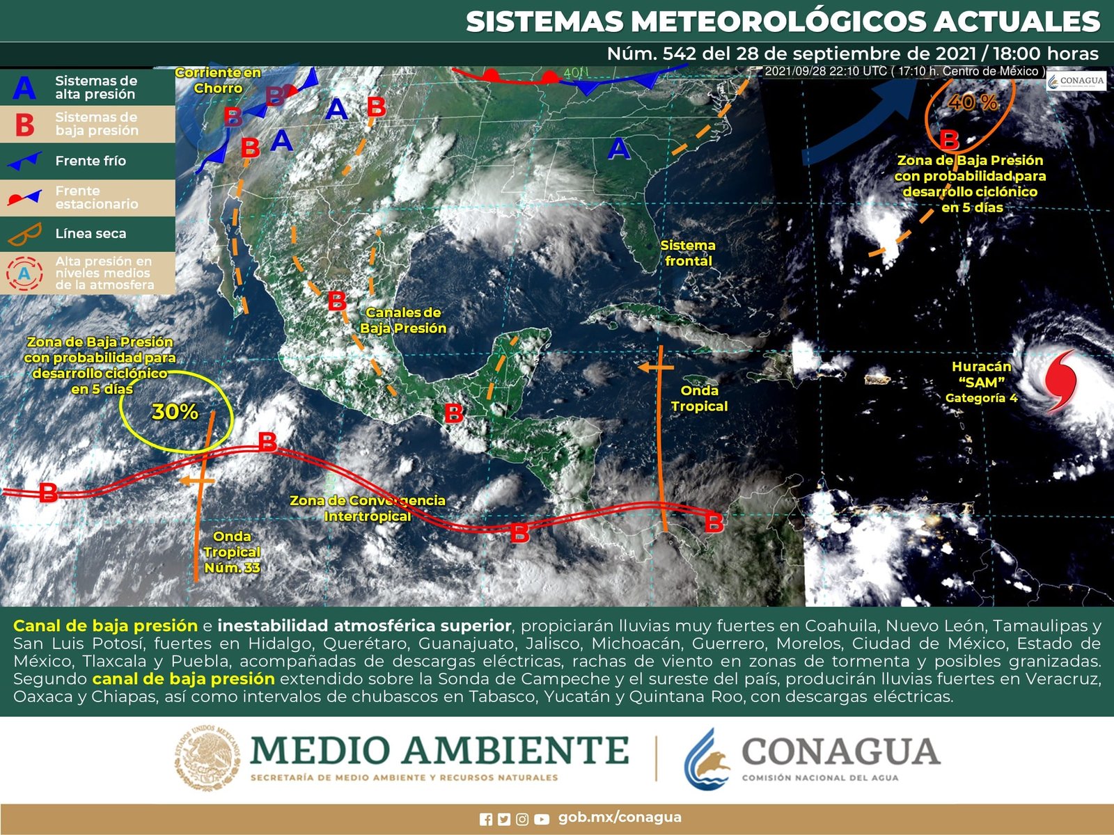 🔊 Escuchar esto Guanajuato tendrá este miércoles hasta 55 por ciento de probabilidad de lluvias debido a la presencia de un canal de baja presión, dio a conocer el Servicio Meteorológico Nacional (SMN). De acuerdo con su último reporte, el organismo dependiente de la Conagua pronostica que la Mesa Central del país tendrá cielo medio nublado e incremento de nubosidad hacia la tarde con lluvias muy fuertes en Guanajuato, Querétaro, Hidalgo, Puebla y Tlaxcala, además de lluvias fuertes en Morelos. Proseguirá el ambiente fresco en la región, con bancos de niebla y temperaturas frías por la mañana en zonas montañosas, así como vientos de dirección variable de 10 a 20 km/h acompañados de rachas de 30 a 40 km/h. NUBLADOS EN GUANAJUATO El reporte indica que Guanajuato tendrá nublados vespertinos con temperaturas máximas promedio de 24 grados. El pronóstico indica que hay 55 por ciento de probabilidad de lluvia en todo el estado debido a un canal de baja presión y las lluvias podrían presentarse en el transcurso de la tarde-noche. Los municipios del suroeste del estado son los que menos probabilidad tienen de lluvia con 40-45 por ciento. Las temperaturas mínimas promedio serán de 14 grados durante la noche y madrugada del jueves. INESTABILIDAD EN EL CENTRO Para el resto del país, el SMN dijo que el canal de baja presión se extenderá sobre la Mesa del Norte y la Mesa Central. Este fenómeno interaccionará con una línea seca localizada sobre Coahuila y con inestabilidad atmosférica superior lo que ocasionará chubascos y lluvias fuertes a muy fuertes acompañadas de descargas eléctricas y posibles granizadas sobre entidades del norte, noreste, occidente, centro y sur de México. CHUBASCOS EN EL SUR Un segundo canal de baja presión extendido sobre el sureste del país y el ingreso de humedad del Mar Caribe y Golfo de México producirán chubascos y lluvias fuertes a muy fuertes con actividad eléctrica en el oriente y sureste del territorio nacional. Por otra parte, prevalecerá el ambiente vespertino caluroso sobre entidades del norte y noreste de la República Mexicana, así como en la Península de Yucatán. Los sistemas meteorológicos mencionados ocasionarán este miércoles: Lluvias fuertes con puntuales muy fuertes (50 a 75 mm) en los estados de Guanajuato, Querétaro, Hidalgo, Veracruz, Puebla, Tlaxcala y Estado de México. Intervalos de chubascos con lluvias puntuales fuertes (25 a 50 mm) en Coahuila, Nuevo León, Tamaulipas, San Luis Potosí, Ciudad de México, Morelos, Jalisco, Michoacán, Guerrero, Oaxaca y Chiapas. Intervalos de chubascos (5 a 25 mm) en Zacatecas, Aguascalientes, Colima, Tabasco y Quintana Roo. Lluvias aisladas (0.1 a 5 mm) en Sonora, Chihuahua, Sinaloa, Nayarit, Campeche y Yucatán. Posible caída de granizo en Coahuila, Nuevo León, Tamaulipas, San Luis Potosí, Veracruz, Puebla, Tlaxcala, Estado de México, Hidalgo, Querétaro, Guanajuato, Jalisco, Michoacán, Guerrero y Oaxaca. Viento con rachas de 50 a 60 km/h en Sonora, Coahuila, Nuevo León y Tamaulipas. Temperaturas máximas de 35 a 40 °C en Coahuila, Nuevo León, Tamaulipas, Campeche, Yucatán y Quintana Roo. Temperaturas mínimas para la madrugada del jueves de 0 a 5 °C y posibles heladas en zonas montañosas de Chihuahua, Durango y Estado de México. Compartir