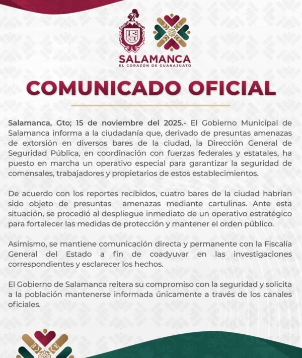 Al menos cuatro bares de la ciudad de Salamanca se vieron en la necesidad de cerrar sus puertas el fin de semana, luego de que extorsionadores armados arribaron a los establecimientos con amenazas. De acuerdo con información del diario El Universal, los individuos dejaron cartulinas con mensajes temerarios y presuntamente realizaron disparos al aire. Ante el peligro, los encargados suspendieron el servicio a los clientes y cerraron los negocios, ubicados en la zona norte del municipio. En las cartulinas se advertía a los dueños de los bares que debían comunicarse a un número telefónico en menos de 24 horas. REACCIÓN INMEDIATA El hecho fue reportado al Sistema 911 la noche del sábado, por lo que elementos de Seguridad se presentaron en los bares denominados “La Refi”, “El Despecho”, “El Antiguo” y “Puerta 4”. Policías municipales, Guardia Nacional, Fuerzas de Seguridad del Estado y Ejército realizaron un amplio despliegue en torno de los antros y determinaron que debían permanecer cerrados. En un comunicado, el Gobierno Municipal de Salamanca informó que, derivado de presuntas amenazas de extorsión a diversos bares de la ciudad, se puso en marcha un operativo especial para garantizar la seguridad de comensales, trabajadores y propietarios de esos establecimientos. (Fotos: Tomadas de El Universal y Archivo) Compartir Navegación de entradas Caen chilangas con montones de ropa robada Van 2 mil becas para mujeres guanajuatenses