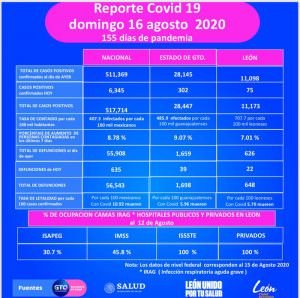 🔊 Escuchar esto La Secretaría de Salud federal confirmó la noche de este domingo 214 nuevas muertes por coronavirus Covid-19 en el país, con lo que suman 56 mil 757, mientras que la cifra de contagios acumulados llegó a 522 mil 162, 4 mil 448 más que el sábado. La Secretaría de Salud de Guanajuato (SSG) reportó a su vez 39 decesos más, una de las cifras más altas, aunque los contagios volvieron a mantenerse bajos. [read more=”Leer más” less=”Leer menos”] 🔊 Nota completa En conferencia desde Palacio Nacional, el director de Epidemilogía federal, José Luis Alomía, señaló que hay 573 mil 723 casos negativos y 81 mil 046 casos sospechosos. Comentó que hasta el corte de la tarde del domingo hay mil 176,931 personas estudiadas. Además, apuntó que la dependencia calcula que hay 557 mil 978 negativos y 41 mil 104 casos activos estimados. El funcionario federal destacó que esta es la tercera semana consecutiva con descenso en la totalidad de los casos del nuevo coronavirus. Asimismo, indicó que “por primera vez en el panorama nacional la curva de casos recuperados es mayor a las personas que se estima tienen la enfermedad”. Alomía acotó que también disminuyó el porcentaje de la ocupación de camas en las unidades hospitalarias. De las 31 mil 346 que hay en el país, hay disponibles 19 mil 358 y están ocupadas 11 mil 988 camas. En cuanto a las camas con ventilador, el director de Epidemiología anotó que hay en total 10 mil 340. De estas, 6 mil 851 están disponibles y 3 mil 489 están ocupadas. Por último, Hugo López-Gatell, subsecretario de Salud y el principal portavoz del gobierno federal durante la pandemia, reiteró que “siguen disminuyendo los casos y las defunciones por coronavirus”. “La buena noticia que damos hoy no debe ser interpretada como que volvemos a todas las actividades. La razón por la que va disminuyendo es gracias a usted, que ha mantenido la paciencia para quedarse en casa”, concluyó. ALZA DE MUERTES EN GUANAJUATO Por su parte, la Secretaría de Salud de Guanajuato (SSG) reportó la muerte de 39 personas por Covid-19 en las últimas 24 horas, con lo que la cifra se situó en 1,698. Además, la dependencia estatal informó de 302 contagios para sumar 28 mil 447 desde que inició la pandémica en la entidad. En su reporte, se indica que León sigue aparecieron arriba en contagios y decesos con 11 mil 173 casos y 648 decesos. Le siguen Irapuato con 3 mil 262 y 175; Celaya con 2 mil 103 y 167; Silao con mil 429 y 123; y con Salamanca mil 497 y 69. Las defunciones por municipio quedan así: León 648 Irapuato 175 Celaya 167 Silao 123 Salamanca 69 Sn. Fco. Del Rincón 39 Guanajuato capital 38 Cortazar 37 Pénjamo 35 Juventino Rosas 32 Sn. Luis de la Paz 32 Romita 31 Dolores Hidalgo 30 Valle de Santiago 22 Sn. Miguel de Allende 20 Villagrán 18 Apaseo el Grande 17 Salvatierra 16 Abasolo 15 Purísima del Rincón 13 Acámbaro 12 San José Iturbide 12 Comonfort 9 Moroleón 9 Apaseo el Alto 8 Uriangato 8 Jaral del Progreso 7 Yuriria 7 San Felipe 6 Jerécuaro 5 Manuel Doblado 5 Doctor Mora 4 Ocampo 4 Cuerámaro 3 Huanímaro 3 Sn. Diego de la Unión 3 Santiago Maravatío 3 Tarandacuao 3 Victoria 3 Tarimoro 2 Tierra Blanca 2 Xichú 2 Pueblo Nuevo 1 [/read] Compartir