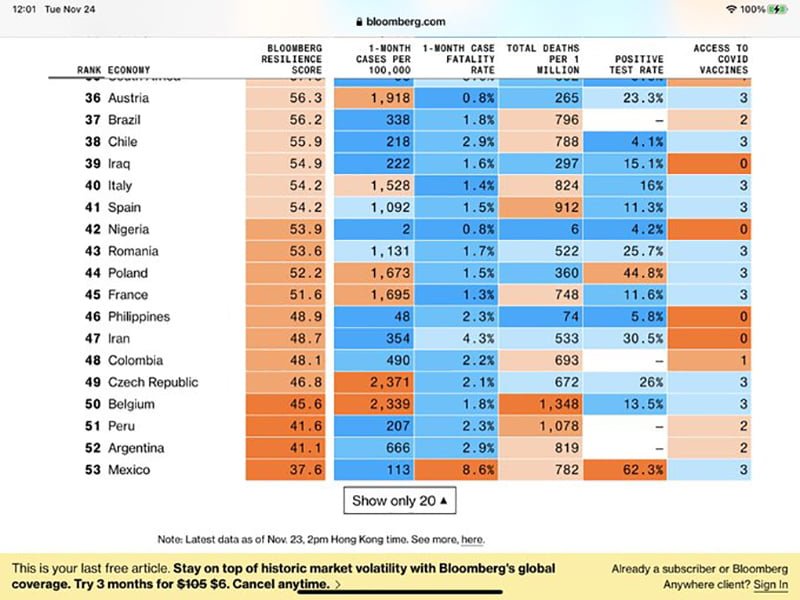 🔊 Escuchar esto México fue ubicado como el peor país en cuanto al manejo de la pandemia. Un análisis de la agencia Bloomberg con base a cifras, atención médica y económica, ubicó al país en el último lugar. Ensu información, Bloomberg dice que, a medida que el Covid-19 se ha extendido por todo el mundo, ha desafiado las ideas preconcebidas sobre qué lugares abordarían mejor la peor crisis de salud pública en una generación. Las economías avanzadas como Estados Unidos y Reino Unido, clasificadas según varias medidas anteriores a 2020 como las más preparadas para una pandemia, se han visto repetidamente abrumadas por los casos y enfrentan un regreso a costosos cierres, añadió Bloomberg citado por el diario El Financiero. Mientras tanto, otros países, incluso naciones en desarrollo, han desafiado las expectativas, algunos casi han eliminado el patógeno dentro de sus fronteras. Bloomberg analizó los números para determinar los mejores lugares para estar en la era del coronavirus: ¿dónde se ha manejado el virus de manera más efectiva con la menor cantidad de interrupciones para los negocios y la sociedad? El “Ranking de Resiliencia Covid” puntuó economías de más de 200 mil millones de dólares en diez métricas clave: Crecimiento de los casos de virus Tasa de mortalidad general Capacidades de prueba Acuerdos de suministro de vacunas que los lugares han forjado Capacidad del sistema sanitario local Impacto de las restricciones relacionadas con el coronavirus, como los bloqueos económicos, y la libertad de circulación de los ciudadanos. El resultado es un puntaje general, que es una especie de fotografía instantánea de cómo se está desarrollando la pandemia en 53 lugares del mundo en este momento. Bloomberg dijo que Ranking cambiará a medida que los países cambien sus estrategias, el clima cambie y la carrera se intensifique por una vacuna viable. ASÍ EL PUNTAJE El ranking de Bloomberg es el siguiente: Nueva Zelanda 85.4 Japón 85 Taiwán 82.9 Corea del Sur 82.3 Finlandia 82 Noruega 81.3 Australia 81.2 China 80.6 Dinamarca 77 Vietnam 74.3 Singapur 74.2 Hong Kong 73.6 Canadá 73.2 Alemania 71.2 Tailandia 70.2 Suecia 68.7 Emiratos Árabes Unidos 67.5 Estados Unidos 66.5 Indonesia 66.1 Irlanda 65.1 Israel 65 Rusia 65 Países Bajos 64.4 Bangladesh 64.2 Egipto 63.2 Suiza 62.3 Pakistán 61.7 Reino Unido 61.5 Malasia 61.4 Turquía 60.6 Grecia 59.9 Arabia Saudita 59.6 Portugal 59.2 India 58.1 Sudáfrica 57.8 Austria 56.3 Brasil 56.2 Chile 55.9 Irak 54.9 Italia 54.2 España 54.2 Nigeria 53.9 Rumania 53.6 Polonia 52.2 Francia 51.6 Filipinas 48.9 Irán 48.7 Colombia 48.1 República Checa 46.8 Bélgica 45.6 Perú 41.6 Argentina 41.1 México 37.6 Compartir