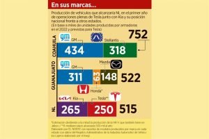 Suponiendo que la sudcoreana KIA -también instalada en Nuevo León- mantuviera su producción del 2022, que fue de 265 mil vehículos, ese estado alcanzaría de inicio las 515 mil unidades con el primer año de operaciones planeadas de Tesla.