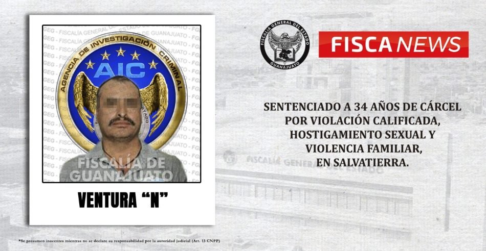 El sujeto, identificado como Ventura “N” fue encontrado culpable de los delitos de violación calificada, hostigamiento sexual y violencia familiar en contra de dos víctimas menores de edad, en el municipio de Salvatierra.