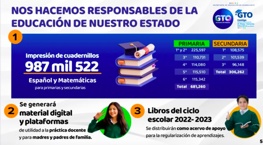 Siempre sí. La Secretaría de Educación de Guanajuato (SEG) anunció que sí distribuirá los libros de texto de la Secretaría de Educación Pública (SEP), pero adjuntará cuadernillos de apoyo en las materias de matemáticas y español. El titular de la SEG, Jorge Hernández Meza dijo que serán casi un millón de cuadernillos y materiales de apoyo que vendrán a fortalecer y complementar la enseñanza educativa en todo Guanajuato. El funcionario, consignó TV4 Noticias, informó que bajo el cumplimiento de Interés Superior del Niño y el derecho a la educación se determinó repartir los textos federales en todo el territorio estatal. “NOS HACEMOS CARGO” No obstante, destacó que Guanajuato determinó asumir la responsabilidad de “hacernos cargo de la educación del estado, Guanajuato se hace cargo de su educación”. Ante ello, aseguró que estos cuadernillos y guías han sido construidos con las aportaciones de expertos y del magisterio. El objetivo, explicó, es generar materiales que permitan a los maestros contar con el mayor número de elementos para la impartición de clases. Guanajuato fue el primero de presentar una revisión minuciosa y detallada y sobre todo de una actitud proactiva de no solo descalificar por descalificar, sino proponer estrategias de solución como estos cuadernillos”, añadió. CONTENIDO CIENTÍFICO Siempre buscaremos contenido científico, no adoctrinante. Siempre buscando sembrar futuro y con el objetivo de ser el mejor sistema de educación del país”, precisó el funcionario estatal. “Hemos decidido entregar los libros de texto gratuito (de la SEP), pero completaremos con un cuadernillo. Guanajuato puede estar tranquilo, porque hay maestros con gran profesionalismo y por primera vez contarán con el mayor número de materiales para la impartición de clases”, señaló. ESTUDIANTES BLINDADOS La SEG distribuirá 987 mil 522 cuadernillos impresos de español y matemáticas para primarias y secundarias Además, se generará material digital y plataformas de utilidad a la práctica docente y para madres y padres de familia. Guanajuato es el estado que más captó libros de texto del ciclo anterior, que serán de gran ayuda a la enseñanza. Para toda la estrategia, se cuenta con el respaldo de las secciones 13 y 45 de la SNTE El ciclo escolar 2023-2024 arrancó con un millón 220 mil alumnos, 55 mil 471 docentes, que ya imparten clases en 10 mil 377 escuelas. La inversión en la educación por parte del Gobierno del Estado es de más de mil millones de pesos en 2023. Compartir