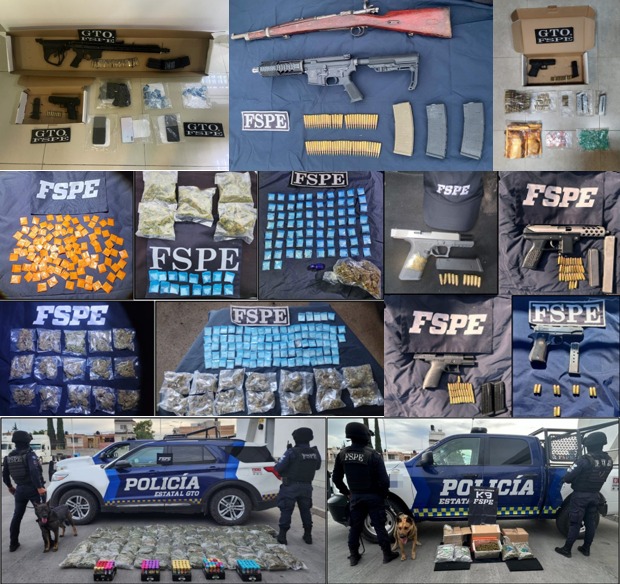 Fuerzas de seguridad del estado de Guanajuato decomisaron durante enero 21 armas largas y cortas, además de 46 mil 500 dosis de drogas.