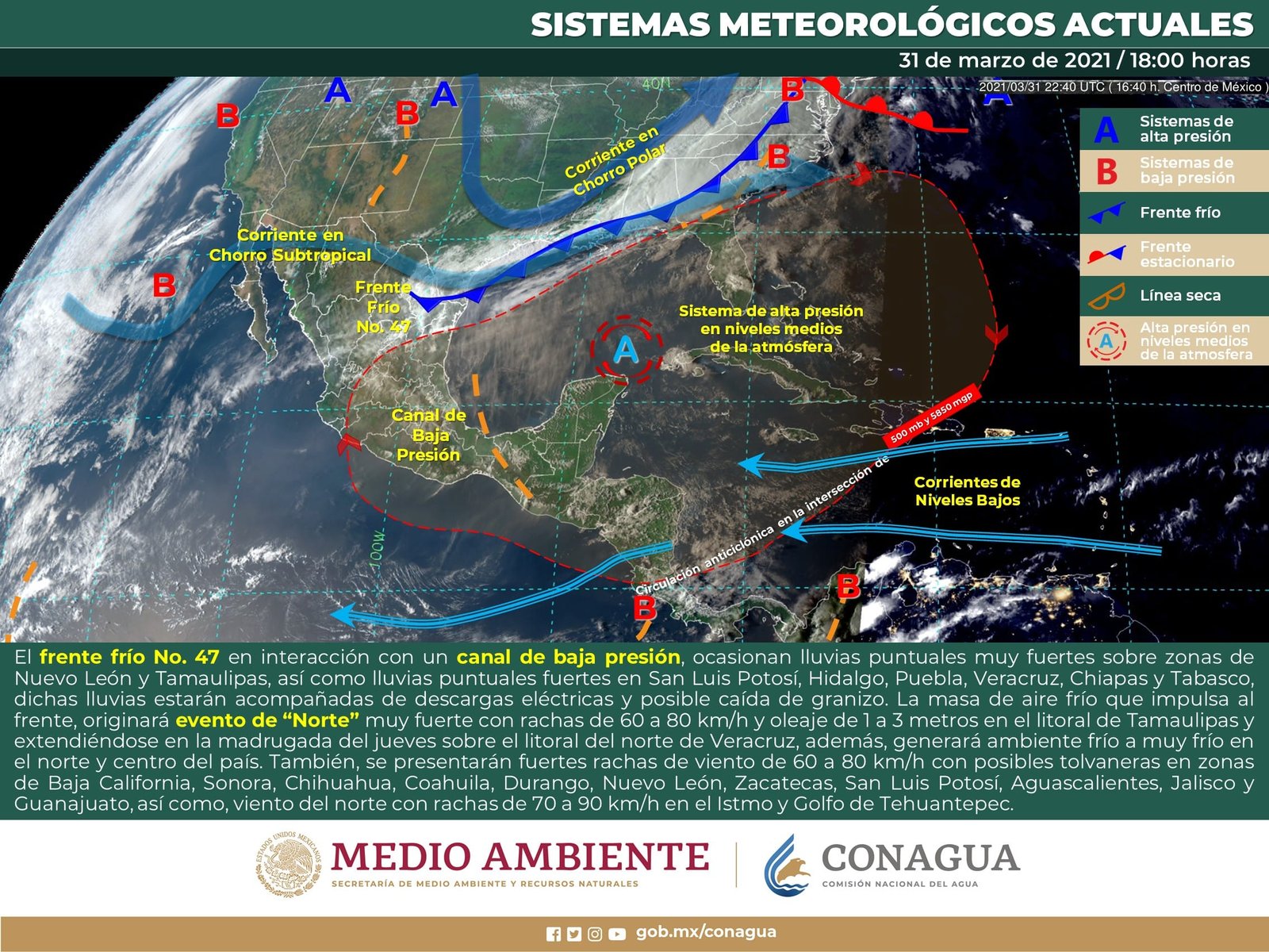 Viento con rachas de 60 a 70 km/h y tolvaneras en Chihuahua, Durango, Coahuila, Nuevo León, San Luis Potosí, Aguascalientes, Zacatecas, Guanajuato, Querétaro, Hidalgo, Puebla, Tlaxcala, Estado de México, Ciudad de México, Morelos y Guerrero.