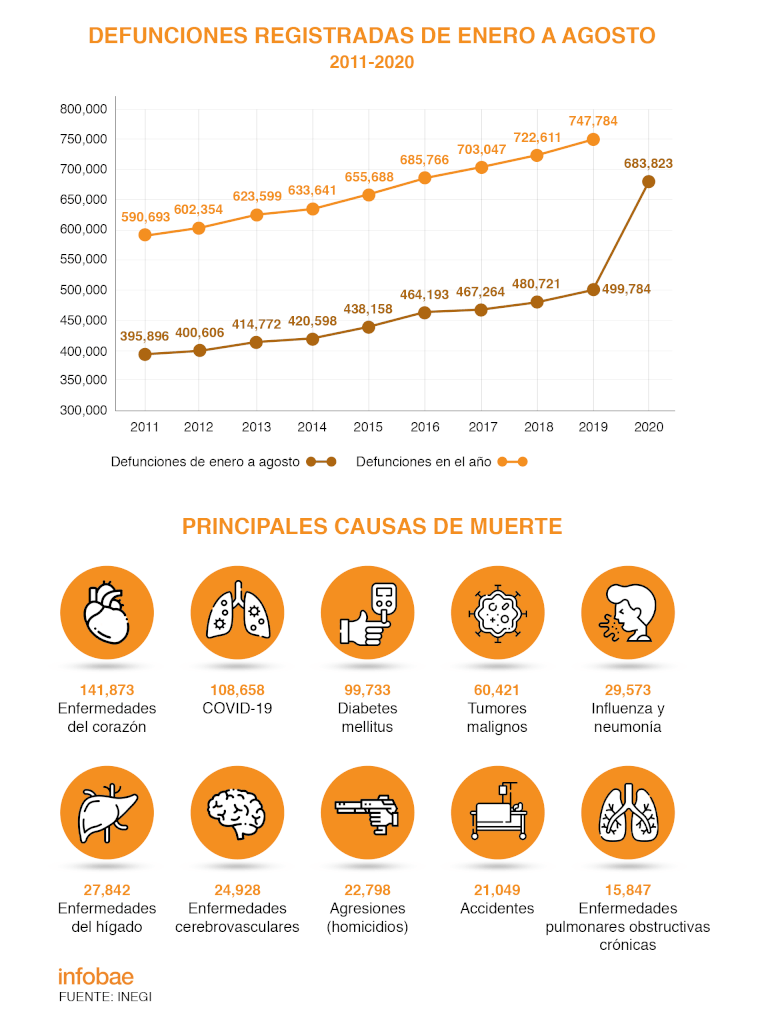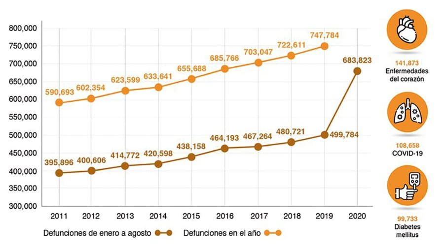 En México fallecieron un total de 683 mil 823 personas en los primeros ocho meses del 2020, lo cual significa un incremento de 36.8 por ciento en comparación con el mismo periodo del 2019 o 184 mil 039 decesos más.