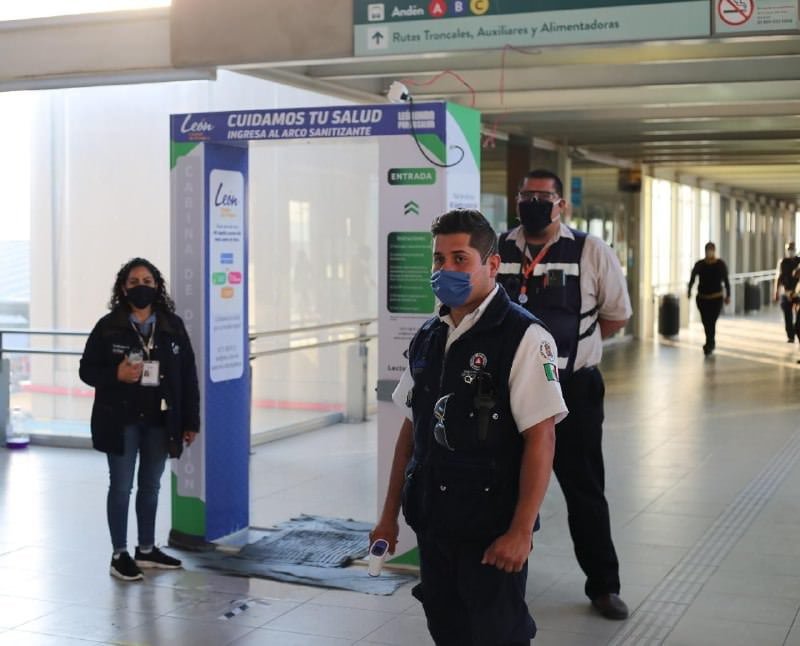 Como parte de las acciones realizadas en la estación de transferencia, se instalaron arcos sanitizantes en los accesos, personal de Protección Civil se encargó de medir la temperatura a los usuarios para riesgos, cuerpos de seguridad y personal de Movilidad dotaban de gel antibacterial a las personas.
