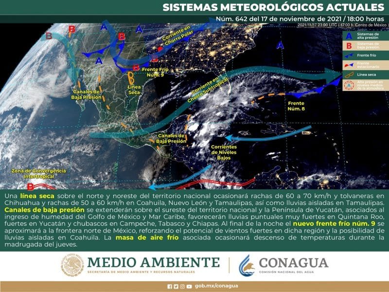 🔊 Escuchar esto Este jueves, Guanajuato tendrá día soleado con temperaturas máximas de 26 grados y nula probabilidad de lluvia, dio a conocer el Servicio Meteorológico Nacional (SMN). De acuerdo con su último reporte, el organismo dependiente de la Comisión Nacional del Agua (Conagua) pronostica que la Mesa Central del país tendrá cielo medio nublado en el transcurso del día con probabilidad de lluvias intensas solo en Puebla, fuertes en Querétaro e Hidalgo. Seguirán por la mañana bancos de niebla y ambiente frío a muy frío con heladas al amanecer en zonas de Guanajuato, Hidalgo, Puebla y Tlaxcala. Por la tarde habrá ambiente templado con viento acompañado de rachas de 50 a 60 km/h en Guanajuato. FRÍO NOCTURNO EN GUANAJUATO El reporte indica que Guanajuato continuará con frío nocturno con heladas, principalmente en la zona noreste. Las temperaturas máximas promedio se ubicarán en los 26 grados con nula probabilidad de lluvia y baja humedad. Los municipios del corredor industrial además registrarán rachas de viento durante la tarde. Las mínimas en esas zonas serán de 8 a 9 grados. El noreste del estado seguirá fresco con máximas de 20 grados a lo largo del día y mínimas de 7 a 8 grados. LLEGA NUEVO FRENTE FRÍO Para el resto del país, el SMN dijo que un nuevo frente frío recorrerá rápidamente el norte, noreste y oriente del país. Este fenómeno, en interacción con un canal de baja presión sobre el occidente del Golfo de México, originará chubascos y lluvias puntuales fuertes acompañadas de descargas eléctricas sobre entidades del noreste, oriente y sureste de la República Mexicana, con lluvias muy fuertes a puntuales intensas en Puebla, Veracruz y Chiapas. La masa de aire frío que impulsa al sistema, provocará vientos fuertes con tolvaneras y un nuevo descenso de temperatura sobre entidades de la Mesa del Norte y la Mesa Central, con heladas al amanecer en sus zonas altas. PEGA EVENTO NORTE Asimismo, a partir de la tarde del jueves se prevé evento de “Norte” fuerte en el litoral del Golfo de México, e Istmo y Golfo de Tehuantepec. Un canal de baja presión sobre la Península de Yucatán, aunado al ingreso de humedad del Mar Caribe, ocasionará probabilidad de chubascos y lluvias fuertes en dicha región. Los sistemas meteorológicos mencionados ocasionarán este jueves: Lluvias fuertes muy fuertes con lluvias puntuales intensas (75 a 150 mm) en los estados de Veracruz, Chiapas y Puebla. Intervalos de chubascos con lluvias puntuales fuertes (25 a 50 mm) en Tamaulipas, San Luis Potosí, Querétaro, Hidalgo, Oaxaca, Tabasco, Campeche, Yucatán y Quintana Roo. Lluvias aisladas (0.1 a 5 mm) en Nuevo León Coahuila, Guanajuato, Estado de México y Tlaxcala. Evento de “Norte” con rachas de 70 a 80 km/h en el Istmo de Tehuantepec y con oleaje de 1 a 3 metros: Golfo de Tehuantepec. Viento con rachas de 60 a 70 km/h y tolvaneras en Chihuahua, Coahuila, Nuevo León, Tamaulipas, Zacatecas y San Luis Potosí. Evento de Norte con rachas de 50 a 70 km/h en las costas de Tamaulipas y Veracruz. Viento con rachas de 50 a 60 km/h en Aguascalientes, Jalisco y Guanajuato. Temperaturas máximas de 30 a 35 °C en Sonora, Sinaloa, Nayarit, Tabasco, Campeche, Yucatán y Quintana Roo, y en las costas de Jalisco, Colima, Michoacán, Guerrero, Oaxaca y Chiapas. Temperaturas mínimas para la madrugada del viernes de -5 a 0 °C con heladas en las zonas montañosas de Chihuahua, Durango, Zacatecas, Guanajuato, Querétaro, Hidalgo, Estado de México, Tlaxcala y Puebla. Temperaturas mínimas para la madrugada del viernes de 0 a 5 °C y posibles heladas en zonas montañosas de Baja California, Sonora, Coahuila, Nuevo León, Tamaulipas, San Luis Potosí, Aguascalientes, Jalisco, Michoacán, Veracruz, Oaxaca, Morelos y Ciudad de México. Heladas: Sonora, Chihuahua, Coahuila, Nuevo León, Durango, Zacatecas, Aguascalientes, Guanajuato, Hidalgo, Estado de México, Tlaxcala, Puebla y Veracruz. Compartir