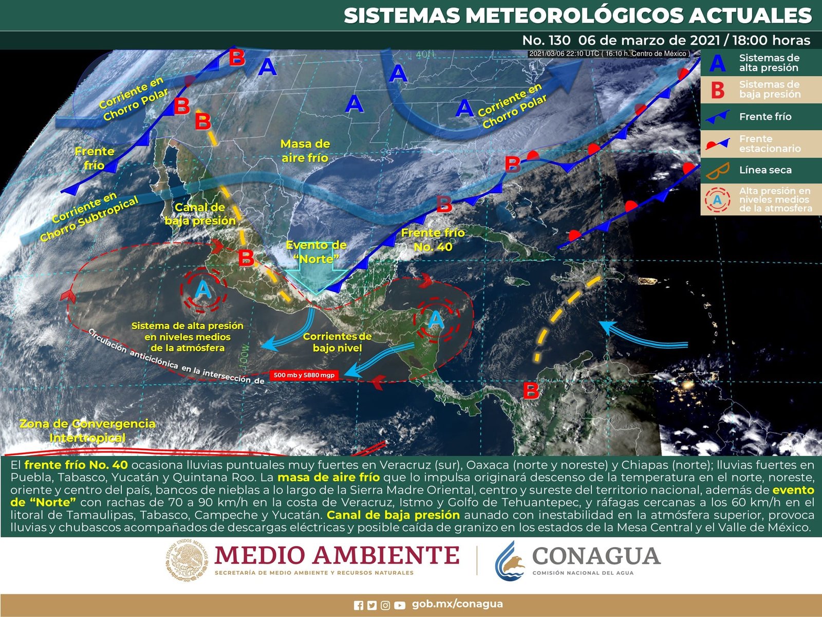 🔊 Escuchar esto Guanajuato tendrá este domingo día con algunos nublados, pero temperaturas máximas de 30 grados, dio a conocer el Servicio Meteorológico Nacional (SMN). De acuerdo con su último reporte, el organismo dependiente de la Comisión Nacional del Agua (Conagua) pronostica que la Mesa Central del país registre cielo nublado por la tarde con chubascos acompañados de descargas eléctricas y posible caída de granizo solo en Hidalgo, Puebla, Tlaxcala y Morelos. Ligera probabilidad de lluvias aisladas en los estados de Guanajuato y Querétaro. Se esperan temperaturas frías y bancos de niebla al amanecer en zonas montañosas. CALORÓN EN GUANAJUATO El reporte indica que habrá ambiente caluroso en Guanajuato con rachas de viento a lo largo del día, principalmente en el sur y centro del estado. León, Celaya, Salamanca, Irapuato y Guanajuato capital tendrán máximas de 30 a 31 grados con algunos nublados y apenas 15 por ciento de probabilidad de lluvia. Las temperaturas mínimas para estos municipios será de 7 y 8 grados promedio, añadió el reporte. Los municipios del noreste, por el contrario, tendrán máximas de 20 a 21 grados a lo largo del día con mínimas de 5 a 6 grados en noche y madrugada del lunes. MUCHO VIENTO EN EL NORTE Para el resto del país, el SMN dijo que la masa de aire frío asociada al frente No. 40 mantendrá ambiente diurno templado a fresco sobre entidades del noreste y oriente de la República Mexicana. Se espera también evento de “Norte” en el sur del Golfo de México, la Península de Yucatán, Istmo y Golfo de Tehuantepec. NEBLINA EN EL SUR A su vez continuará la presencia de bancos de niebla sobre las sierras de Veracruz, Puebla y Oaxaca, así como lluvias y chubascos dispersos acompañados de tormentas eléctricas y granizadas sobre entidades del noreste, centro, oriente y sureste del país, con lluvias puntales fuertes en Chiapas. OCCIDENTE Y CENTRO CALUROSO Por otro lado, la circulación anticiclónica en niveles medios de la atmósfera mantendrá la onda de calor sobre entidades del occidente y sur del territorio nacional, además de ambiente caluroso a muy caluroso en el centro y sureste del país. Los sistemas meteorológicos ocasionarán este domingo: Intervalos de chubascos con lluvias puntuales fuertes (25.1 a 50.0 mm) acompañados de descargas eléctricas y rachas fuertes de viento en Chiapas (norte), Tamaulipas, San Luis Potosí, Veracruz, Oaxaca, Tabasco, Campeche y Quintana Roo; con posibles granizadas en Hidalgo, Puebla, Tlaxcala, Estado de México, Ciudad de México y Morelos. Lluvias aisladas (0.1 a 5.0 mm) en Nuevo León, Querétaro, Guerrero y Yucatán. Evento de “Norte” con rachas de 70 a 90 km/h en Istmo y Golfo de Tehuantepec. Evento de “Norte” con rachas de 50 a 60 km/h en la Sonda de Campeche y costas de Yucatán y Quintana Roo. Evento de “Norte” con rachas de 30 a 50 km/h en el litoral de Veracruz y Tabasco. Viento con rachas de 50 a 60 km/h en Golfo de California, Baja California, Baja California Sur, Coahuila, Durango, Zacatecas, Aguascalientes y San Luis Potosí. Oleaje de 3 a 4 metros de altura significante en el Golfo de Tehuantepec. Oleaje de 2 a 3 metros de altura significante en las costas de Yucatán y Quintana Roo (norte). Temperaturas máximas de 40 a 45°C en Michoacán y Guerrero. Temperaturas máximas de 35 a 40°C en Nayarit, Jalisco, Colima, Guanajuato, Estado de México (suroeste), Morelos, Puebla (suroeste), Oaxaca (costa), Chiapas (costa), Campeche, Yucatán y Quintana Roo. Temperaturas mínimas para la madrugada del lunes de -5 a 0°C con heladas en zonas montañosas de Chihuahua y Durango. Temperaturas mínimas para la madrugada del lunes de 0 a 5°C y posibles heladas en las zonas montañosas de Baja California, Sonora, Coahuila, Nuevo León, San Luis Potosí, Zacatecas, Aguascalientes, Guanajuato, Hidalgo, Estado de México, Tlaxcala y Puebla. Compartir