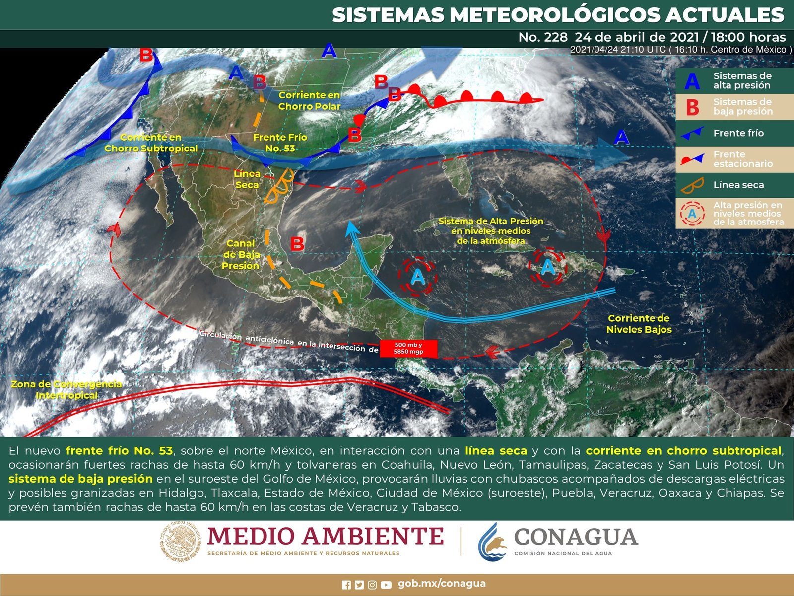 🔊 Escuchar esto Este domingo el calor en todo Guanajuato se prolongará hasta entrada la noche con baja probabilidad de lluvia, dio a conocer el Servicio Meteorológico Nacional (SMN). De acuerdo con su último reporte, el organismo dependiente de la Comisión Nacional del Agua (Conagua) prevé que para la Mesa Central del país se presente cielo medio nublado e incremento de nubosidad hacia la tarde, con lluvias puntuales fuertes solo en Hidalgo y Puebla, intervalos de chubascos en Tlaxcala y lluvias aisladas en Morelos y Querétaro. En el amanecer seguirá ambiente fresco y cálido a caluroso por la tarde. Se mantiene el viento de dirección variable de 15 a 30 km/h con rachas de 50 km/h en zonas de tormenta. CALOR TODO EL DÍA EN GUANAJUATO El reporte indica que todos los municipios de Guanajuato mantendrán altas temperaturas con máximas promedio de 32 grados. La entidad registra probabilidad de solo 15 por ciento de lluvia, aunque se esperan rachas de viento vespertinas. A diferencia de los días previos, las mínimas promedio en todo el estado serán de 14 a 15 grados con poco viento nocturno. Solo en los municipios del noreste tendrán temperaturas mínimas de 11 y 12 grados durante la noche y madrugada del lunes. SE VA FRENTE FRÍO 53 Para el resto del país, el SMN prevé que el frente frío No. 53 se extenderá sobre la región central del Golfo de México, dejando de afectar al territorio nacional. Por otra parte, una línea seca en Coahuila, en interacción con un canal de baja presión extendido sobre el noreste y oriente del país y con la corriente en chorro subtropical, ocasionarán rachas fuertes de viento en el noroeste, norte y noreste del país, además de chubascos y lluvias puntuales fuertes en el centro y oriente de México. HASTA 45 GRADOS EN EL SUR Finalmente, una circulación anticiclónica en niveles medios de la atmósfera generará ambiente vespertino caluroso a muy caluroso sobre gran parte del territorio nacional, con temperaturas máximas de 40 a 45 °C en Chiapas, Tabasco, Campeche y Yucatán. Los sistemas meteorológicos ocasionarán este domingo: Intervalos de chubascos con lluvias puntuales fuertes (25.1 a 50.0 mm) en los estados de Hidalgo, Puebla y Chiapas. Intervalos de chubascos (5.1 a 25.0 mm) en Ciudad de México, Estado de México, Tlaxcala, Veracruz y Oaxaca. Lluvias aisladas (0.1 a 5.0 mm) en Michoacán, Guerrero, Morelos, Querétaro y Tabasco. Posible caída de granizo en Ciudad de México, Estado de México, Tlaxcala, Puebla e Hidalgo. Posibilidad de tormentas eléctricas en Querétaro, Hidalgo, Veracruz, Puebla, Tlaxcala, Estado de México, Ciudad de México, Morelos, Michoacán, Guerrero, Oaxaca y Chiapas. Viento con rachas de 60 a 70 km/h en el Golfo de California y con tolvaneras en Baja California, Sonora, Chihuahua, Coahuila, Nuevo León, Tamaulipas, San Luis Potosí, Zacatecas y Durango. Viento con rachas de 50 a 60 km/h en Aguascalientes, Jalisco y Guanajuato. Temperaturas máximas de 40 a 45 °C en Chiapas, Tabasco, Campeche y Yucatán. Temperaturas máximas de 35 a 40 °C en Sonora (sur), Chihuahua, Coahuila, Nuevo León, Tamaulipas, San Luis Potosí, Durango, Sinaloa, Nayarit, Jalisco, Colima, Michoacán, Guerrero, Guanajuato (suroeste), Querétaro (norte), Hidalgo (norte), Estado de México (suroeste), Morelos, Puebla (norte y suroeste), Oaxaca, Veracruz y Quintana Roo. Temperaturas mínimas para la madrugada del lunes de -5 a 0 °C y heladas en las zonas montañosas de Baja California, Chihuahua y Durango. Temperaturas mínimas para la madrugada del lunes de 0 a 5 °C y posibles heladas en zonas montañosas de Sonora. Compartir