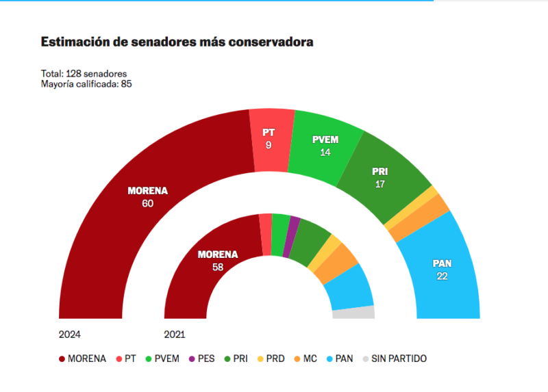 El grupo parlamentario de Morena en el Senado se quedará corto por tres asientos para tener la mayoría calificada. Justo cuando se lleva a cabo el recuento ordenado por el Instituto Nacional Electoral (INE), hay posibilidades de que pierda otro escaño, mientras la oposición peleaba la sobre representación, coincidieron analistas. Previo al recuento y con base en el PREP, los resultados de las elecciones apuntan a que el partido oficialista y sus aliados lograron 83 senadurías, quedando a solo tres votos de alcanzar una mayoría calificada necesaria para pasar reformas a la Constitución. CAMBIOS ¿MENORES? Los resultados de la composición del Congreso tras las elecciones del 2 de junio todavía están sujetas a cambios menores, que se determinarán en el recuento y en caso de que hubiera partidos que pierdan su registro por no obtener los votos suficientes. Hasta el momento, Morena y los partidos que conforman el bloque, el Partido Verde (PV) y el Partido del Trabajo (PT), tienen 83 escaños, cuando la mayoría calificada es de 85. Según el Programa de Resultados Electorales Preliminares (PREP), los candidatos de la coalición oficialista obtuvieron la mayoría de votos en todos los estados excepto Querétaro y Aguascalientes. El Partido Acción Nacional (PAN) queda como la segunda fuerza política en el Senado, con un estimado de 22 escaños, mientras que el Partido Revolucionario Institucional (PRI) cuenta con unos 17 puestos. En total, partidos de oposición se perfilan para tener 45 de 128 senadurías. (Gráfico y foto: Tomados de El País y La Jornada) Compartir Navegación de entradas Anuncia Morena que en septiembre aprobará el Plan C Tras recuento, Morena pierde Silao y San Miguel queda con el PRI