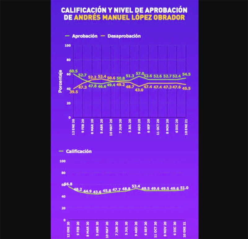 De acuerdo con una encuesta realizada por la organización México elige, el tabasqueño tiene una calificación de 51.0 y una aprobación del 54.5.
