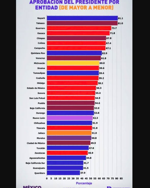 Por otro lado, los estados donde tiene menor nivel de aprobación son Querétaro con 37.9, Guanajuato con 41.5, Baja California 41.7 y Aguascalientes con 44.8.