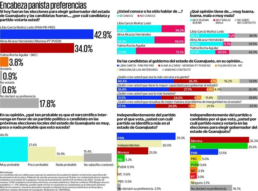 A unos días del arranque de las campañas a la gubernatura en Guanajuato, Libia Dennise García, candidata de la coalición Fuerza y Corazón por Guanajuato (PAN-PRI-PRD), inicia en primer lugar de las preferencias con 42.9 por ciento. La encuesta hecha por el diario nacional El Universal muestra que su rival más cercana, Alma Alcaraz, de la coalición Sigamos Haciendo Historia (Morena-PT-PVEM), reúne 34 por ciento. Libia Dennise inicia la contienda con 8.9 por ciento puntos porcentuales de ventaja, publicó El Universal. A su vez, Yulma Rocha, de Movimiento Ciudadano, reúne solo 3.8 por ciento. SIN DEFINIR El estudio de El Universal también revela que 34.2 por ciento de las personas aún podría cambiar su preferencia y que 32.6 por ciento decidirá por quién votar el día de la elección. Un tema para considerar es el de la posible intervención del narcotráfico en los comicios locales. En la percepción de 46.1 por ciento de los ciudadanos existe la posibilidad de que esto ocurra a favor de un partido político o candidato y sólo 10.9 por ciento piensa que no sucederá, dijo la información de El Universal. MÁS CONOCIDA Libia Dennise es la candidata más reconocida entre los guanajuatenses, con 65.8 por ciento, seguida por Alcaraz, con 55.4 por ciento, mientras Yulma Rocha cuenta con solo 27.9 por ciento. En cuanto a la percepción de las aspirantes, Libia Dennise es quien tiene más valoraciones positivas, con 56.74 por ciento, seguida por Alcaraz Hernández, con 48.5 por ciento; en el caso de Rocha Aguilar, cuenta con 37.2 por ciento de buenas opiniones. (Gráfica: Tomada de El Universal) Compartir Navegación de entradas Amazon invertirá ¡5 mil millones de dólares en Querétaro! Arrancará campaña en la ciudad más insegura del país