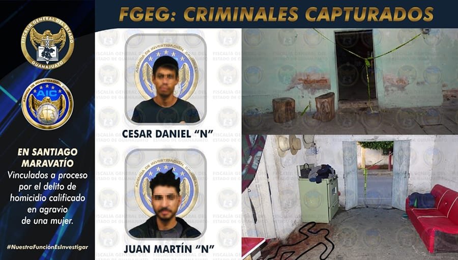 🔊 Escuchar esto La Fiscalía General de Guanajuato (FGE) esclareció un feminicidio cometido por dos sujetos en el municipio de Santiago Maravatío. Un comunicado indicó que “El Chicharrín”, de 29 años, y “El Rábano”, de 31 años, se encuentran bajo custodia y tras ser imputados por la FGE por el delito de homicidio calificado, quedaron vinculados a proceso penal. El pasado 20 de octubre, estos sujetos entraron al hogar de la mujer, identificada como Diana Ivette “N”, a quien privaron de la vida con disparos al cráneo. Antes ya la habían amenazado de muerte por no aceptar vender droga para ellos. Agentes de la Unidad de Homicidios de la FGE detuvieron a este par de sujetos, quien cometieron el crimen en un predio de la calle Álvaro Obregón, del barrio de Guadalupe, del mencionado municipio. César Daniel “N”, “El Chicharrín”, de 29 años, originario de la delegación Azcapotzalco de la Ciudad de México, y Juan Martín “N”, “El Rábano”, de 31 años, ingresaron de manera sorpresiva al predio, con armas de fuego y preguntaron por la mujer. CONFLICTO POR DROGAS Al salir de una habitación, los delincuentes le exigieron dinero por droga que supuestamente le habían dado para su venta. Al mismo tiempo le recriminaron que operara actividades de venta para una organización delictiva contraria. Al no recibir dinero, los sujetos se llevaron varios artículos del domicilio, entre ellos una televisión, mientras mantenían las armas apuntando a las personas que estaban en el inmueble. En minutos, Juan Martín “N”, molesto porque no encontraron dinero en la casa, le realizó detonaciones con su arma a la mujer a corta distancia, provocándole la muerte por heridas penetrantes de cráneo. Los agresores huyeron en una camioneta. Los sujetos fueron vinculados a proceso penal y esperarán en prisión el cierre de la investigación complementaria. Compartir