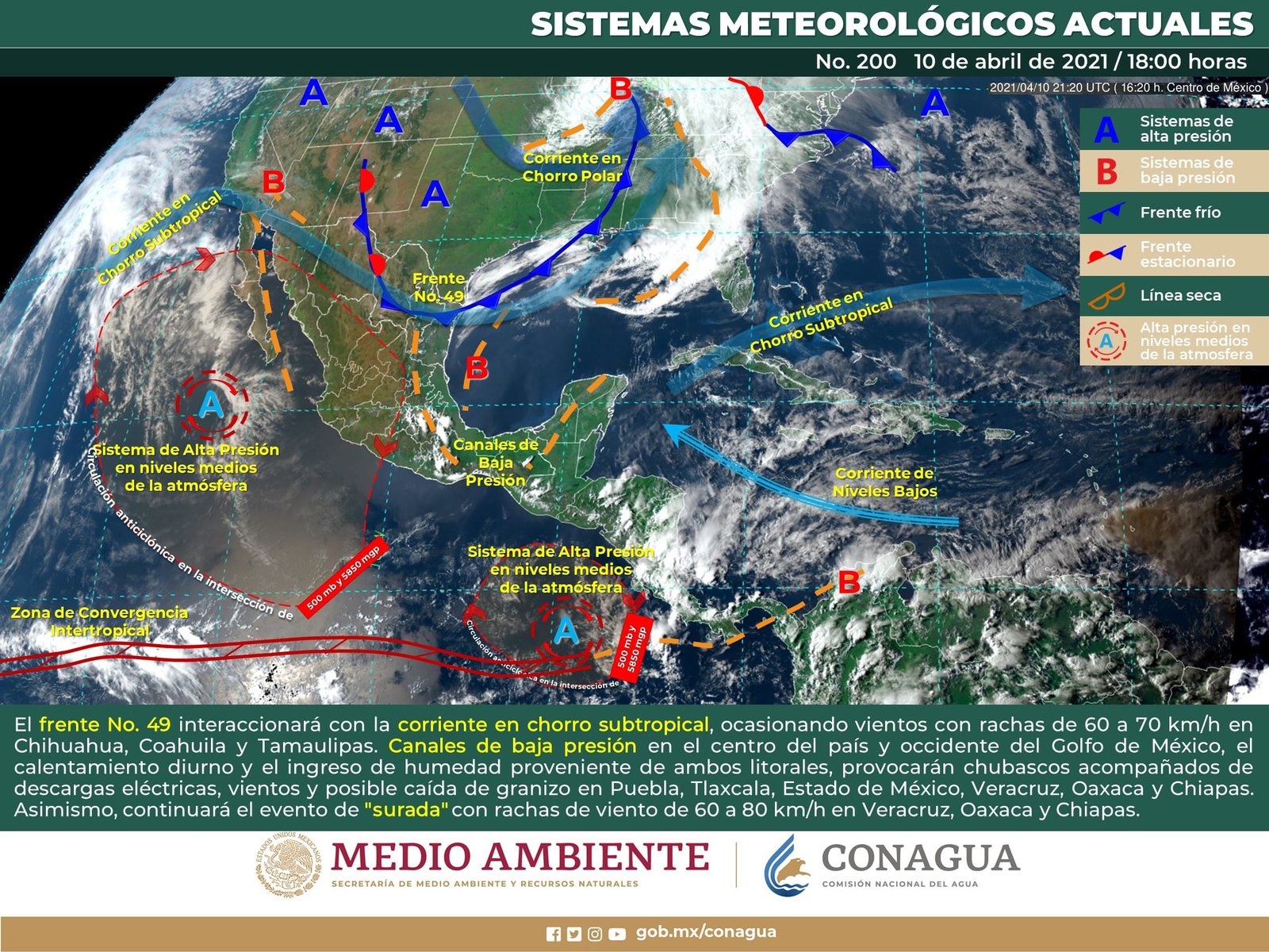 🔊 Escuchar esto Este domingo, Guanajuato continuará con altas temperaturas que marcarán promedio máximo de 33 grados con muy baja probabilidad de lluvia, dio a conocer el Servicio Meteorológico Nacional (SMN). De acuerdo con su último reporte, el organismo dependiente de la Conagua pronostica que la Mesa Central del país tendrá cielo nublado por la tarde, con lluvias aisladas solo en los estados de Hidalgo, Puebla y Tlaxcala. No habrá cambios por la mañana con ambiente fresco en zonas montañosas y caluroso a muy caluroso por la tarde. El viento de dirección variable de 20 a 30 km/h tendrá con rachas de hasta 50 km/h solo en las zonas de tormenta. HASTA 36 GRADOS EN GUANAJUATO El reporte indica que municipios del noreste como Xichú, Tierra Blanca, San Felipe e incluso San Luis de la Paz alcanzarán máximas de 36 grados durante el día con mínimas de 11. Para el resto de los municipios se espera día muy soleado con máximas promedio de 33 grados y algunas rachas de viento vespertinas. Las temperaturas mínimas promediarán los 10 y 12 grados durante la noche madrugada del lunes. LLEGA FRENTE FRÍO AL NORTE Para el resto del país, el SMN dijo que el frente frío No. 49 se extenderá sobre el noreste de México y en interacción con una línea seca sobre el norte del país y con la corriente en chorro subtropical ocasionarán fuertes rachas de viento en el noroeste, norte y noreste del territorio nacional. También se esperan lluvias aisladas acompañadas de descargas eléctricas y posibles granizadas en Nuevo León y Tamaulipas. Se pronostica que al final del día, el sistema frontal se desplace hacia el sur de Estados Unidos, dejando de afectar al país. LLUVIAS EN EL SUR DEL PAÍS Un canal de baja presión sobre el oriente y sureste del territorio nacional originará lluvias y chubascos vespertinos acompañados de rachas de viento, tormentas eléctricas y posibles granizadas en las regiones mencionadas, así como en el centro y sur del país. CALORÓN POR CIRCULACIÓN ANTICICLÓNICA Una circulación anticiclónica en niveles medios de la atmósfera mantendrá el ambiente diurno cálido a muy caluroso sobre gran parte de la República Mexicana. A su vez, se mantendrá la onda de calor sobre entidades del noreste, oriente, sur y sureste de México, incluida la Península de Yucatán, con temperaturas máximas de 40 a 45 °C en zonas de Coahuila, Nuevo León, Tamaulipas, San Luis Potosí, Hidalgo (norte), Puebla (norte), Veracruz, Michoacán, Guerrero, Oaxaca, Chiapas, Tabasco, Campeche y Yucatán. Los sistemas meteorológicos ocasionarán este domingo: Lluvias aisladas (0.1 a 5.0 mm) en Chiapas, Nuevo León, Tamaulipas, Querétaro, Hidalgo, Estado de México, Ciudad de México, Puebla, Tlaxcala, Veracruz, Guerrero, Oaxaca, Tabasco, Campeche, Yucatán y Quintana Roo. Tormentas eléctricas en Nuevo León, Tamaulipas, Querétaro, Hidalgo, Estado de México, Puebla, Tlaxcala, Veracruz, Guerrero, Oaxaca, Tabasco, Campeche, Yucatán y Quintana Roo. Posible caída de granizo en Tlaxcala, Puebla y Oaxaca. Viento de componente sur con rachas de 50 a 70 km/h en Veracruz, Oaxaca, Chiapas y Tabasco. Viento con rachas de 60 a 70 km/h y tolvaneras en Coahuila. Viento con rachas de 50 a 60 km/h en Baja California Sur, Sonora, Chihuahua, Durango, Nuevo León, Zacatecas, San Luis Potosí, Aguascalientes, Jalisco, Campeche, Yucatán y Quintana Roo. Temperaturas máximas de 40 a 45 °C en Nayarit, Veracruz, Michoacán, Guerrero, Oaxaca, Chiapas, Tabasco, Campeche, Yucatán y Quintana Roo. Temperaturas máximas de 35 a 40 °C en Coahuila, Nuevo León, Tamaulipas, San Luis Potosí, Hidalgo (norte), Puebla (norte), Sinaloa, Jalisco, Guanajuato (noreste), Querétaro (norte), Estado de México (suroeste) y Morelos. Temperaturas mínimas para la madrugada del lunes de -5 a 0 °C y heladas en las zonas montañosas de Chihuahua y Durango. Temperaturas mínimas para la madrugada del lunes de 0 a 5 °C y posibles heladas en zonas montañosas de Baja California, Sonora, Zacatecas y Estado de México. Compartir