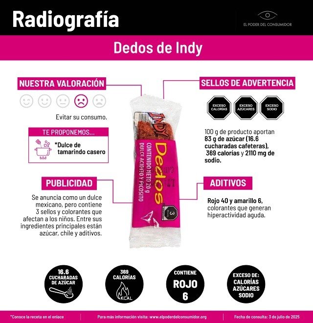 La revista especializada en orientar a los consumidores mexicanos lanzó una advertencia sobre los graves riesgos para la salud infantil asociados al consumo del popular dulce mexicano “Dedos de Indy”. El Poder del Consumidor publicó que estos riesgos se deben a su elevado contenido de azúcares, sodio y aditivos artificiales que pueden afectar el comportamiento y el desarrollo neurológico de los menores. El análisis se realizó en el marco de la campaña “Radiografía de productos”, cuyo propósito es evidenciar los ingredientes nocivos en alimentos ultraprocesados. El producto en cuestión, reconocido por su sabor ácido y picoso, fue clasificado con los tres sellos de advertencia establecidos por la norma mexicana: exceso de calorías, exceso de azúcares y exceso de sodio. REBASA POR MUCHO LOS LÍMITES De acuerdo con el estudio, una porción de 100 gramos del dulce contiene 83 gramos de azúcar, equivalentes a 16.6 cucharadas cafeteras, así como 2,110 miligramos de sodio y 369 calorías. Estas cantidades superan ampliamente las recomendaciones nutricionales diarias para la población infantil, lo que ha encendido las alertas entre especialistas en salud pública y nutrición. Además de los niveles críticos de azúcar y sodio, El Poder del Consumidor advirtió sobre la presencia de colorantes artificiales Rojo 40 y Amarillo 6, ingredientes que han sido vinculados por diversas investigaciones científicas con problemas de hiperactividad y trastornos de conducta en niños. AFECTA AL SISTEMA NERVIOSO Estos aditivos están actualmente bajo vigilancia en la Unión Europea debido a sus posibles efectos negativos en el sistema nervioso. La organización criticó el empaque llamativo y la promoción del dulce con sabores populares como tamarindo con chile, estrategias de marketing que —señalaron— buscan atraer directamente al público infantil, lo cual consideran una forma de publicidad engañosa. La presentación de estos productos oculta los riesgos reales de su consumo frecuente, especialmente en entornos escolares o familiares donde no siempre se tiene acceso a información nutricional clara y comprensible, alertó la asociación civil. EVITA SU CONSUMO Como parte de sus recomendaciones, El Poder del Consumidor exhortó a las familias a evitar el consumo de “Dedos de Indy” y optar por alternativas naturales, como el dulce de tamarindo casero, que puede prepararse sin aditivos ni azúcares en exceso. En su sitio web ofrecen recetas saludables y fáciles de preparar como opciones más seguras para niños y niñas. La organización también hizo un llamado a las autoridades educativas y de salud pública para que refuercen la prohibición de productos ultraprocesados en escuelas y desarrollen campañas de educación alimentaria dirigidas a padres, madres y cuidadores, con el objetivo de fomentar hábitos de consumo más responsables desde la infancia. (Texto y fotos: Tomados de Debate.com.mx) Compartir Navegación de entradas Desnudos falsos con IA desatan ola de extorsiones Transparenta Guanajuato información en seguridad