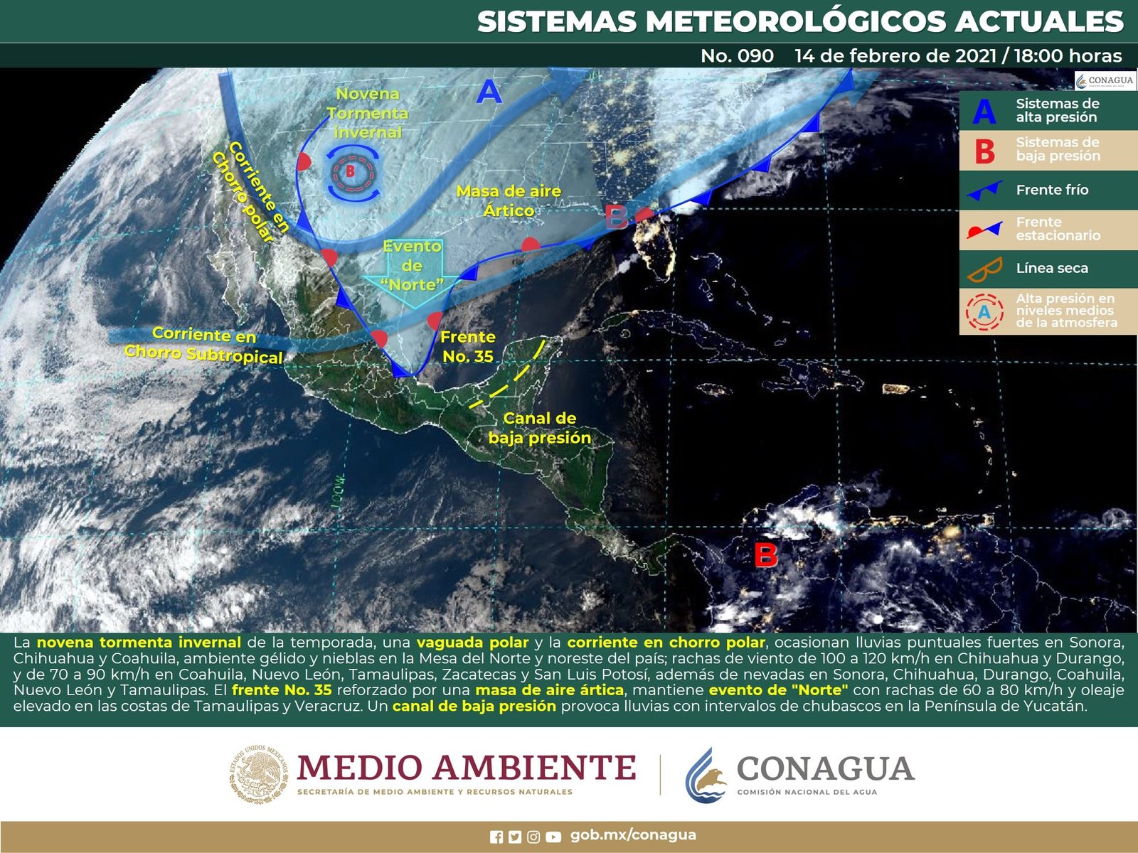 🔊 Escuchar esto Guanajuato mantendrá este lunes elevadas temperaturas durante el día, pero también mínimas promedio de 2 a 3 grados, dio a conocer el Servicio Meteorológico Nacional (SMN). De acuerdo con su último reporte, el organismo dependiente de la Comisión Nacional del Agua (Conagua) pronostica que la Mesa Central del país tendrá cielo nublado con lluvias puntuales fuertes solo en el norte y oriente de Puebla, y lluvias aisladas en Hidalgo y Querétaro. El ambiente continuará muy frío y heladas matutinas en zonas altas, y ambiente cálido por la tarde. Se espera viento del suroeste de 15 a 30 km/h con rachas de 50 a 60 km/h en Guanajuato, Querétaro, Hidalgo, Tlaxcala y Puebla. CALOR DURANTE EL DÍA EN GUANAJUATO El reporte indica que todo Guanajuato tendrá día despejado con temperaturas que alcanzarán los 26 grados promedio y apenas 10 por ciento de probabilidad de lluvia. Las mínimas promedio en la mayor parte de la entidad serán entre los 2 y 4 grados en madrugada y noche. Sin embargo, en municipios del sureste y las zonas altas del estado tendrán mínimas de uno y dos grados con fuertes rachas de viento. LLEGA TORMENTA INVERNAL AL NORTE Para el resto del país, el SMN dijo que la novena tormenta invernal continuará generando lluvias fuertes, vientos intensos y ambiente gélido sobre los estados del norte y noreste de México, así como la probable caída de aguanieve o nieve en zonas de Coahuila, Nuevo León y Tamaulipas. Se prevé que al final del día, el sistema invernal se desplace hacia el sur de Estados Unidos y deje de afectar al territorio nacional. SE EXTIENDE FRENTE FRÍO Por su parte, el frente frío No. 35 reforzado y la masa polar ártica se extenderán sobre el norte, oriente y sureste del país ocasionarán chubascos y lluvias fuertes en el oriente y sureste del país, evento de “Norte” en el litoral del Golfo de México, Istmo y Golfo de Tehuantepec. VIENTO Y TOLVANERAS Corriente en chorro subtropical ocasionará vientos fuertes con tolvaneras sobre entidades del occidente y centro del territorio nacional. Los fenómenos meteorológicos mencionadas ocasionarán este lunes: Intervalos de chubascos con lluvias puntuales fuertes (25 a 50 mm) acompañadas de descargas eléctricas, rachas fuertes de viento y posible caída de granizo en los estados de Veracruz, Puebla, Oaxaca, Chiapas y Tabasco. Intervalos de chubascos (5.1 a 25 mm) acompañados de descargas eléctricas y rachas fuertes de viento en Tamaulipas, San Luis Potosí, Campeche, Yucatán y Quintana Roo. Lluvias aisladas (0.1 a 5.0 mm) en Chihuahua, Coahuila, Sinaloa, Durango, Hidalgo y Querétaro. Posible caída de aguanieve o nieve en sierras de Coahuila, Nuevo León y Tamaulipas. Posible formación de trombas marinas en costas de Campeche y Yucatán. Evento de “Norte” con rachas de 80 a 100 km/h en el litoral de Tamaulipas y Veracruz, con rachas de 60 a 80 km/h en el Istmo y Golfo de Tehuantepec y con rachas de 50 a 60 km/h en el litoral de Tabasco, Campeche y Yucatán. Viento con rachas de 70 a 80 km/h y tolvaneras en Baja California. Viento con rachas de 60 a 70 km/h y tolvaneras en Chihuahua, Coahuila y Nuevo León. Viento con rachas de 50 a 60 km/h Durango, Zacatecas, San Luis Potosí, Aguascalientes, Guanajuato, Querétaro, Hidalgo, Estado de México, Ciudad de México, Tlaxcala y Puebla. Temperaturas máximas de 35 a 40°C en Michoacán, Guerrero, Oaxaca, Chiapas, Tabasco, Campeche, Yucatán y Quintana Roo. Temperaturas mínimas para la madrugada del martes de -15 a -10°C con heladas en las zonas de Sonora, Chihuahua y Durango. Temperaturas mínimas para la madrugada del martes de -10 a -5°C con heladas en zonas de Tamaulipas, Coahuila, Nuevo León, Zacatecas, Aguascalientes, Estado de México, Hidalgo, Tlaxcala y Puebla. Temperaturas mínimas para la madrugada del martes de -5 a 0°C con heladas en zonas de San Luis Potosí, Jalisco (norte), Guanajuato, Ciudad de México y Morelos. Temperaturas mínimas para la madrugada del martes de 0 a 5°C y posibles heladas en zonas de Baja California, Veracruz y Oaxaca. Compartir