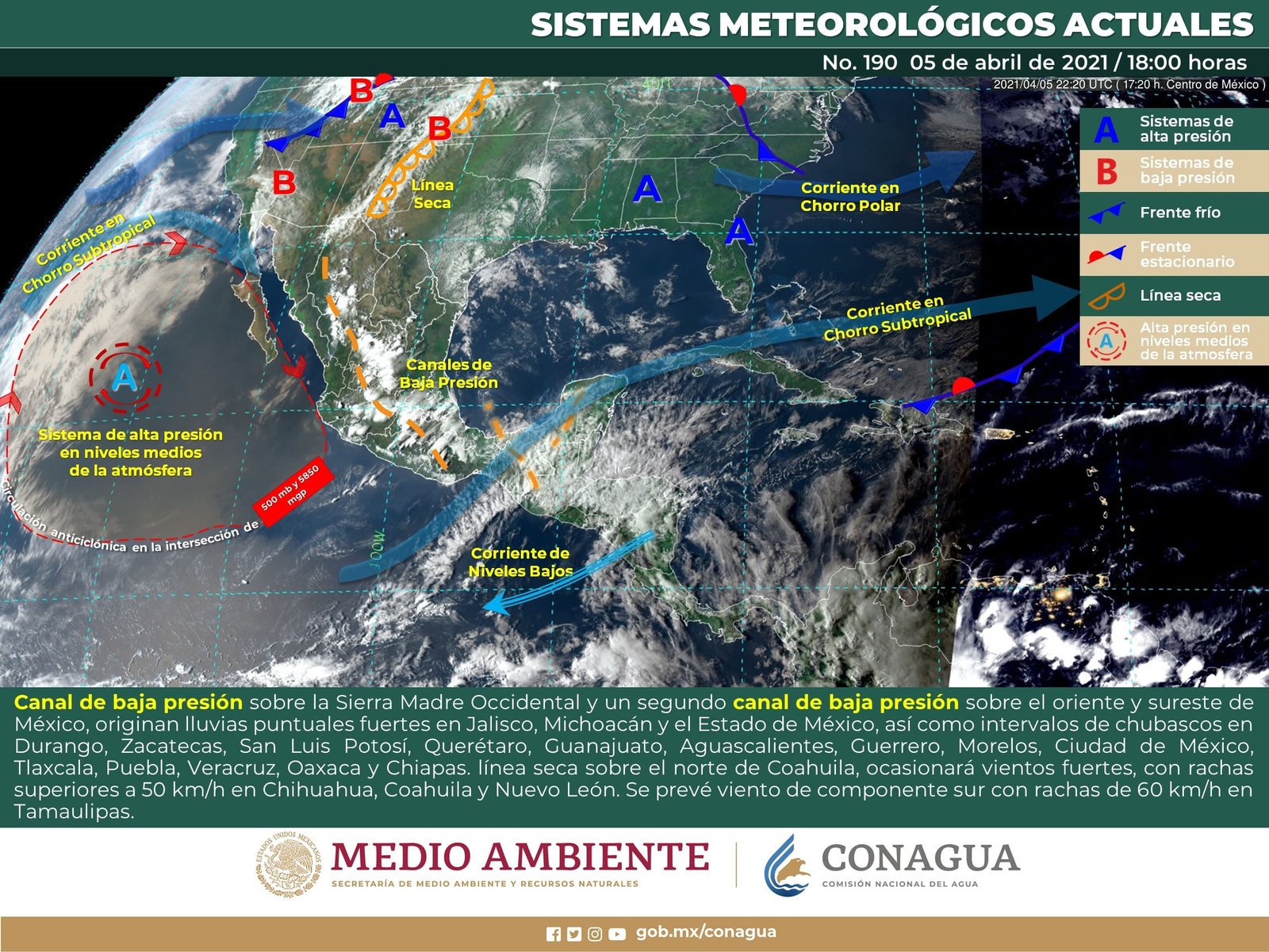 🔊 Escuchar esto Este martes, varias zonas de Guanajuato continuarán con lluvias vespertinas, debido a un canal de baja presión en el centro del país, dio a conocer el Servicio Meteorológico Nacional (SMN). De acuerdo con su último reporte, el organismo dependiente de la Comisión Nacional del Agua (Conagua) prevé que la Mesa Central del país tendrá cielo parcialmente nublado durante el día, por la tarde se incrementará la nubosidad. Por ello se pronostican lluvias puntuales fuertes, acompañadas de tormentas eléctricas y posible caída de granizo en Guanajuato, Querétaro, Hidalgo, Puebla, Tlaxcala y Morelos. Sin cambios en el amanecer con ambiente frío en zonas serranas y cálido por la tarde. El viento de dirección variable de 20 a 30 km/h tendrá rachas de hasta 50 km/h en zonas de tormenta. NORESTE DE GUANAJUATO CON LLUVIAS El reporte indica que la zona noreste de Guanajuato registrará lluvias previsiblemente durante la tarde. Serán los municipios de San Felipe, San Luis de la Paz, Victoria, Doctor Mora y San José Iturbide los que registren chubascos con temperaturas máximas de 26 y mínimas de 10. El resto de los municipios de Guanajuato como la capital, León, Dolores Hidalgo, Celaya, Salamanca e Irapuato tendrán nublados vespertinos, con 35 por ciento de probabilidad de lluvias. Las temperaturas máximas en estas demarcaciones oscilarán entre los 28 grados promedio con mínimas de 11 y rachas de viento vespertinas. VIENTOS FUERTES EN EL NORTE Para el resto del país, el SMN dijo que una línea seca sobre el norte del país interaccionará con la corriente en chorro subtropical, ocasionando rachas de viento fuertes a muy fuertes en el noroeste, norte y noreste del país, además de lluvias aisladas en Coahuila, Nuevo León y Tamaulipas. Asimismo, un canal de baja presión sobre el centro del territorio nacional, en interacción con una vaguada en niveles altos de la atmósfera y con el ingreso de humedad del Océano Pacífico y Golfo de México, originarán fuertes rachas de viento, chubascos y lluvias puntuales fuertes, tormentas eléctricas y posibles granizadas sobre entidades del centro, oriente y sur del país. SE MANTIENE EL CALOR Finalmente, una circulación anticiclónica en niveles medios de la atmósfera mantendrá ambiente cálido a muy caluroso sobre el noroeste, norte, occidente, sur y sureste de México, además de zonas del centro del país. Los sistemas meteorológicos ocasionarán este martes: Intervalos de chubascos con lluvias puntuales fuertes (25.1 a 50.0 mm) acompañados de descargas eléctricas, rachas fuertes de viento durante las tormentas y posibles granizadas en los estados de Guanajuato, Querétaro, Hidalgo, Puebla, Tlaxcala, Estado de México, Ciudad de México, Morelos, Michoacán, Guerrero y Oaxaca. Intervalos de chubascos (5.1 a 25.0 mm) en San Luis Potosí, Veracruz y Chiapas. Lluvias aisladas (0.1 a 5.0 mm) en Coahuila, Nuevo León, Tamaulipas, Campeche y Quintana Roo. Tormentas eléctricas en Coahuila, Nuevo León, San Luis Potosí, Zacatecas, Durango, Jalisco, Michoacán, Guanajuato, Querétaro, Hidalgo, Puebla, Tlaxcala, Estado de México, Ciudad de México, Morelos, Guerrero, Oaxaca y Chiapas. Viento con rachas de 70 a 80 km/h y tolvaneras en Chihuahua. Viento con rachas de 60 a 70 km/h y tolvaneras en Baja California, Sonora, Coahuila, Nuevo León y Tamaulipas. Viento con rachas de 50 a 60 km/h en Golfo de California, Baja California Sur, Durango, San Luis Potosí, Zacatecas, Aguascalientes, Jalisco, Guanajuato, Veracruz, Tabasco, Campeche y Yucatán. Temperaturas máximas de 35 a 40 °C en Baja California Sur, Sonora, Chihuahua, Coahuila, Nuevo León, Sinaloa, Nayarit, Jalisco, Michoacán, Estado de México (suroeste), Morelos, Guerrero, Oaxaca (costa) y Chiapas (costa). Temperaturas mínimas para la madrugada del miércoles de 0 a 5 °C y posibles heladas en las zonas montañosas de Chihuahua y Durango. Compartir
