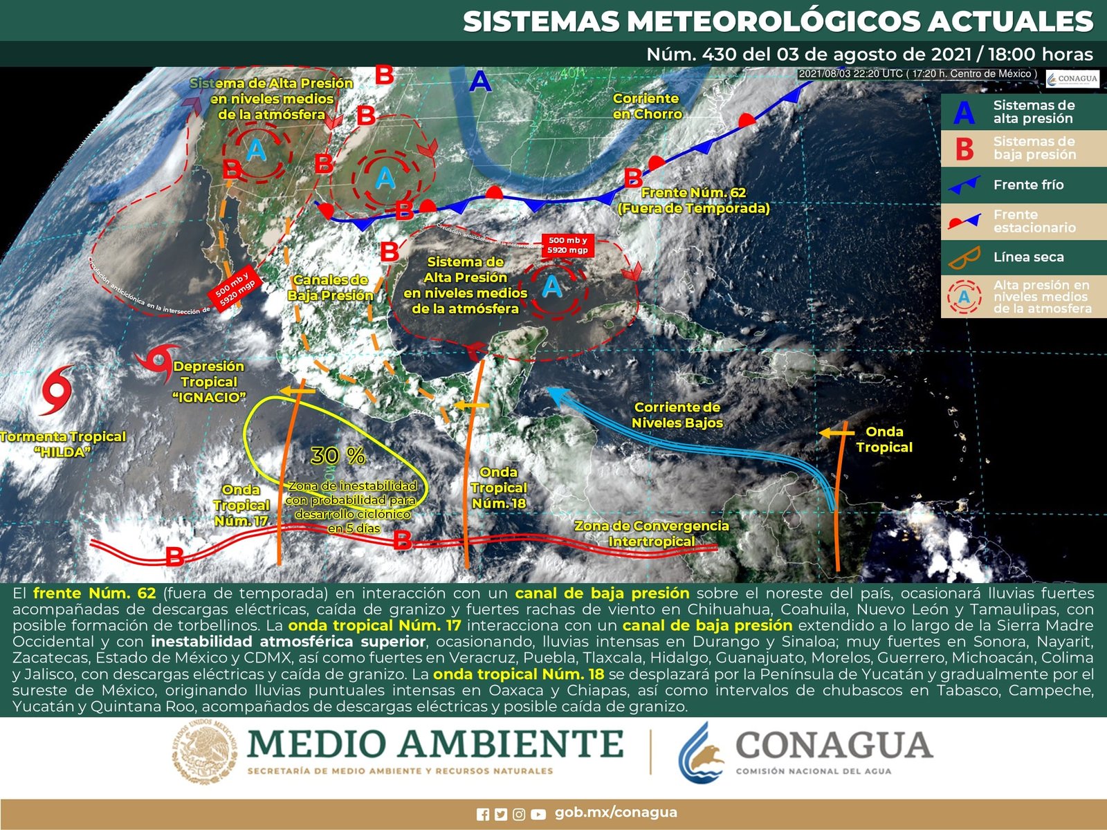 🔊 Escuchar esto Guanajuato seguirá este miércoles bajo los efectos de la onda tropical 17, por lo que se mantiene alta la probabilidad de lluvia durante la tarde y noche, dio a conocer el Servicio Meteorológico Nacional (SMN). De acuerdo con su último reporte, el organismo dependiente de la Comisión Nacional del Agua (Conagua) prevé que la Mesa Central del país tendrá cielo nublado gran parte del día con lluvias puntuales muy fuertes en Guanajuato; así como fuertes en Morelos, Querétaro, Hidalgo, Puebla y Tlaxcala. Proseguirá el ambiente frío a fresco al amanecer y cálido por la tarde, mientras que el viento de dirección variable de 10 a 25 km/h en la región tendrá rachas de hasta 40 km/h en zonas de tormenta. LLUVIAS VESPERTINAS EN GUANAJUATO El reporte indica que Guanajuato tendrá día con nublados y con temperaturas máximas de 25 grados promedio. Todos los municipios de la entidad continuarán con lluvias vespertinas y nocturnas, aunque variarán en intensidad. Los municipios de León, Guanajuato capital, Dolores Hidaldo, Comonfort, Pénjamo, Celaya, Salamanca e Irapuato tendrán probabilidad de 65 por ciento de lluvia desde las 16 horas, y se prolongarían con intervalos hasta la noche. Los municipios del noreste registrarán termómetros más bajos con 23 grados máximas y mínimas de 14 durante y madrugada del jueves. FRENTE FRÍO ESTACIONARIO EN EL NORTE Para el resto del país, el SMN dijo que el frente 62 (fuera de temporada) se extenderá con características de estacionario sobre el norte y noreste del país. El fenómeno interaccionará con divergencia en niveles altos de la atmósfera ocasionando chubascos y lluvias fuertes a puntuales muy fuertes acompañadas de descargas eléctricas y posibles granizadas sobre las regiones mencionadas. LLUVIAS EN EL NOROESTE Un canal de baja presión se extenderá a lo largo de la Sierra Madre Occidental, en interacción con divergencia en altura, provocará probabilidad de lluvias fuertes a muy fuertes con actividad eléctrica y posible caída de granizo en el noroeste y occidente del país. Asimismo, la onda tropical Núm. 17 se localizará al sur de las costas de Baja California Sur, dejando de afectar las costas de México. TORMENTAS EN EL SUR Por otra parte, la onda tropical 18 recorrerá el sureste, oriente, sur y centro del territorio nacional originando probabilidad de lluvias fuertes a muy fuertes, descargas eléctricas y posibles granizadas sobre las regiones mencionadas, pronosticándose tormentas puntuales intensas en Oaxaca y Guerrero. SIGUE CALOR EN EL NORTE Finalmente, se mantendrá el ambiente caluroso a muy caluroso sobre entidades del noroeste, occidente, norte, noreste y oriente de México, así como en la Península de Yucatán, con temperaturas máximas de 40°C a 45°C en el noroeste de Sonora. Los fenómenos meteorológicos mencionados ocasionarán este miércoles: Lluvias muy fuertes con lluvias puntuales intensas (75.1 a 150.0 mm) en los estados de Guerrero y Oaxaca. Lluvias fuertes con lluvias puntuales muy fuertes (50.1 a 75.0 mm) en Sonora, Chihuahua, Coahuila, Nuevo León, Tamaulipas, Durango, Sinaloa, Guanajuato, Estado de México, Veracruz (sur) y Chiapas. Intervalos de chubascos con lluvias puntuales fuertes (25.1 a 50.0 mm) en Baja California Sur, Aguascalientes, Zacatecas, Nayarit, Jalisco, Michoacán, Morelos, Ciudad de México, Querétaro, Hidalgo, Puebla, Tlaxcala y Tabasco. Intervalos de chubascos (5.1 a 25.0 mm) en San Luis Potosí, Colima y Campeche. Lluvias aisladas (0.1 a 5.0 mm) en Yucatán y Quintana Roo. Posible caída de granizo en Sonora, Coahuila, Nuevo León, Aguascalientes, Zacatecas, Durango, Sinaloa, Nayarit, Jalisco, Colima, Michoacán, Guanajuato, Querétaro, Hidalgo, Veracruz, Puebla, Tlaxcala, Estado de México, Ciudad de México, Morelos, Guerrero, Oaxaca y Chiapas. Posibilidad de tormentas eléctricas en Baja California Sur, Sonora, Chihuahua, Coahuila, Nuevo León, Tamaulipas, San Luis Potosí, Aguascalientes, Zacatecas, Durango, Sinaloa, Nayarit, Jalisco, Colima, Michoacán, Guanajuato, Querétaro, Hidalgo, Veracruz, Puebla, Tlaxcala, Estado de México, Ciudad de México, Morelos, Guerrero, Oaxaca, Chiapas, Tabasco, Campeche y Yucatán. Viento con rachas de 60 a 70 km/h con tolvaneras y posible formación de torbellinos en Sonora, Coahuila, Nuevo León y Tamaulipas. Viento con rachas de 50 a 60 km/h en Baja California, Chihuahua, San Luis Potosí, Zacatecas, Durango, Campeche, Yucatán y el Golfo de California. Temperaturas máximas de 40 a 45 °C en Baja California y Sonora. Temperaturas máximas de 35 a 40 °C en Baja California Sur, Sinaloa, Coahuila, Nuevo León, Tamaulipas, San Luis Potosí (oriente), Veracruz (norte), Tabasco, Campeche, Yucatán y Quintana Roo. Temperaturas mínimas para la madrugada del jueves de 0 a 5 °C y posibles heladas en zonas montañosas de Chihuahua, Durango, Estado de México, Hidalgo, Tlaxcala y Puebla. Compartir