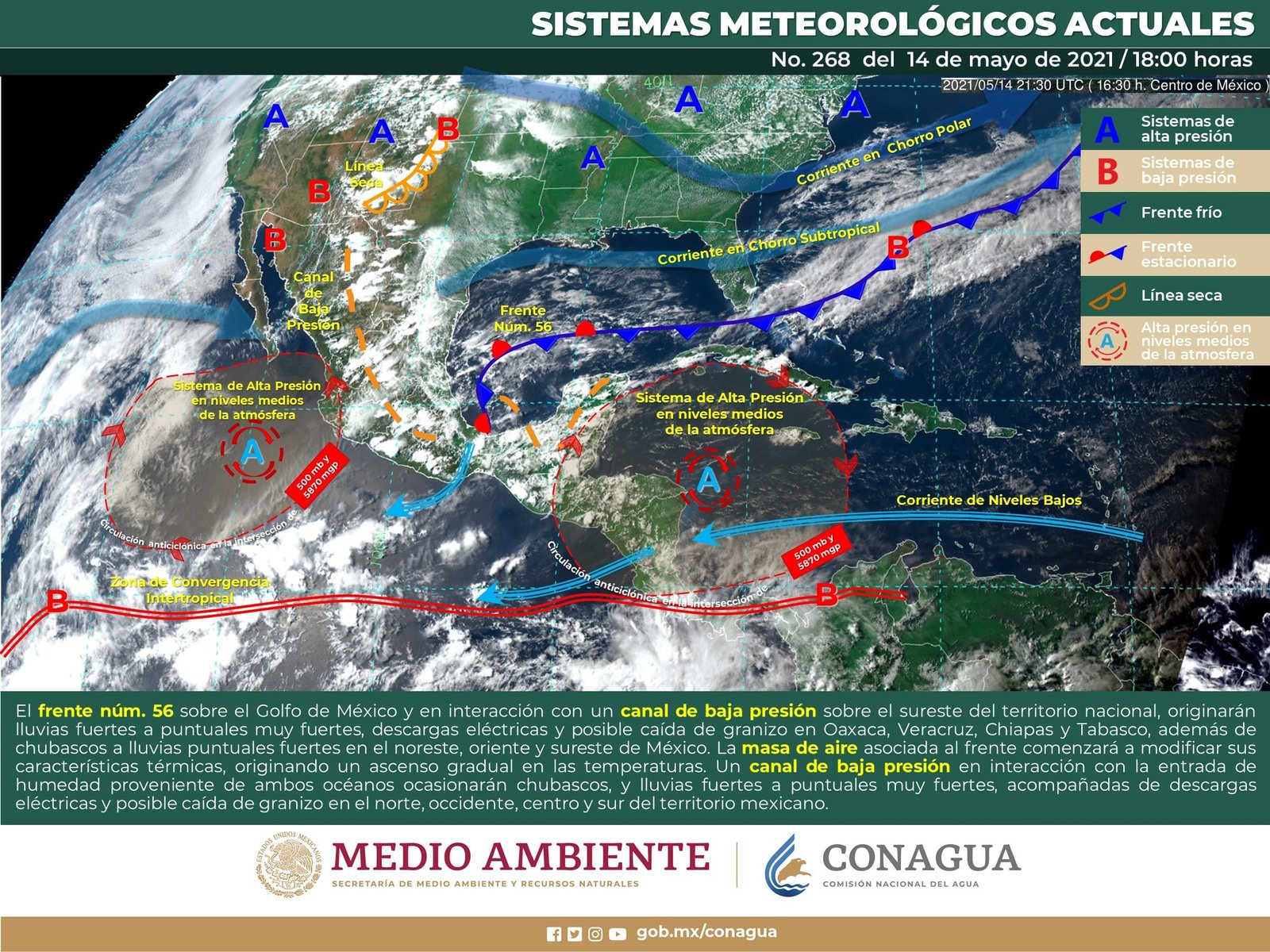 🔊 Escuchar esto La mayor parte del territorio de Guanajuato tendrá este sábado probabilidad de 55 a 60% de lluvia a lo largo de la tarde y noche con máximas de 27 grados, dio a conocer el Servicio Meteorológico Nacional (SMN). De acuerdo con su último reporte, el organismo dependiente de la Comisión Nacional del Agua (Conagua) pronostica que la Mesa Central del país tendrá cielo medio nublado a nublado durante el día con lluvias puntuales fuertes en los estados de Hidalgo, Guanajuato, Querétaro, Puebla y Tlaxcala, además de chubascos en Morelos. Se espera también ambiente fresco al amanecer con bancos de niebla en zonas serranas de Hidalgo y Puebla, y ambiente cálido a caluroso por la tarde en la región. El viento de dirección variable 10 a 25 km/h llevará rachas de 40 km/h en la región. TORMENTAS EN GUANAJUATO El reporte indica que las temperaturas máximas promedio en Guanajuato oscilarán entre los 26 y 27 grados, aunque en la zona noreste llegarán a 24 grados. Los municipios que tienen de 55 a 70 por ciento de probabilidad de tormentas en la tarde y noche son León, Guanajuato capital, Dolores Hidalgo, Celaya, Comonfort, Salamanca e Irapuato, añadió el reporte. Las temperaturas mínimas en estos municipios oscilarán entre los 13 y 14 grados, mientras que los del noreste tendrán 11 grados promedio durante la noche y madrugada del domingo. SE ESTACIONA EN EL CENTRO FRENTE 56 Para el resto del país, el SMN indicó que el sistema frontal No. 56 se extenderá con características de estacionario sobre el centro y noroeste del Golfo de México y continuará interactuando con un canal de baja presión sobre el sureste del país. Esta combinación originará chubascos vespertinos y lluvias fuertes acompañadas de descargas eléctricas y posibles granizadas sobre entidades del noreste, oriente y sureste del territorio nacional. LLUVIAS EN EL CENTRO Y OCCIDENTE Canal de baja presión prevalecerá sobre el norte, occidente y centro del territorio nacional, en interacción con divergencia en altura, ocasionará chubascos vespertinos y lluvias puntuales fuertes acompañadas de descargas eléctricas y posibles granizadas en las regiones mencionadas. Desprendimientos nubosos de la Zona de Convergencia Intertropical originarán lluvias fuertes a muy fuertes en el sur de México. CALORÓN EN EL NORTE Y SUR Una circulación anticiclónica en niveles medios de la atmósfera mantendrá ambiente vespertino caluroso a muy caluroso sobre el noroeste, occidente y sur del país, además de la Península de Yucatán, con temperaturas máximas de 40 a 45 °C en zonas de Sonora, Sinaloa, Campeche y Yucatán. Los sistemas meteorológicos ocasionarán este sábado: Lluvias fuertes con lluvias puntuales muy fuertes (50.1 a 75.0 mm) en los estados de Michoacán, Guanajuato, Guerrero, Oaxaca y Chiapas. Intervalos de chubascos con lluvias puntuales fuertes (25.1 a 50.0 mm) en Coahuila, Nuevo León, Tamaulipas, San Luis Potosí, Querétaro, Estado de México, Morelos, Puebla, Veracruz, Tabasco, Campeche, Yucatán y Quintana Roo. Intervalos de chubascos (5.1 a 25.0 mm) en Zacatecas, Aguascalientes, Jalisco, Colima, Hidalgo, Ciudad de México y Tlaxcala. Lluvias aisladas (0.1 a 5.0 mm) en Chihuahua, Durango, Sinaloa y Nayarit. Posibilidad de tormentas eléctricas en Chihuahua, Durango, Coahuila, Nuevo León, Tamaulipas, San Luis Potosí, Zacatecas, Aguascalientes, Sinaloa, Nayarit, Jalisco, Colima, Guanajuato, Querétaro, Hidalgo, Puebla, Tlaxcala, Estado de México, Ciudad de México, Morelos, Guerrero, Veracruz, Oaxaca, Chiapas, Tabasco, Campeche, Yucatán y Quintana Roo. Viento con rachas de 60 a 70 km/h en el Golfo de California y con tolvaneras en Baja California, Chihuahua, Coahuila, Nuevo León y Tamaulipas. Viento con rachas de 50 a 60 km/h en Sonora, Durango, Zacatecas, San Luis Potosí, Campeche, Yucatán, Istmo y Golfo de Tehuantepec. Temperaturas máximas de 35 a 40 °C en Baja California, Sonora, Nuevo León, Tamaulipas, San Luis Potosí, Sinaloa, Nayarit, Jalisco, Colima, Michoacán, Estado de México (suroeste), Guerrero, Oaxaca, Veracruz, Tabasco, Campeche, Yucatán, Chiapas y Quintana Roo. Temperaturas mínimas para la madrugada del domingo de 0 a 5 °C y posibles heladas en zonas montañosas de Baja California, Sonora, Chihuahua y Durango. Compartir