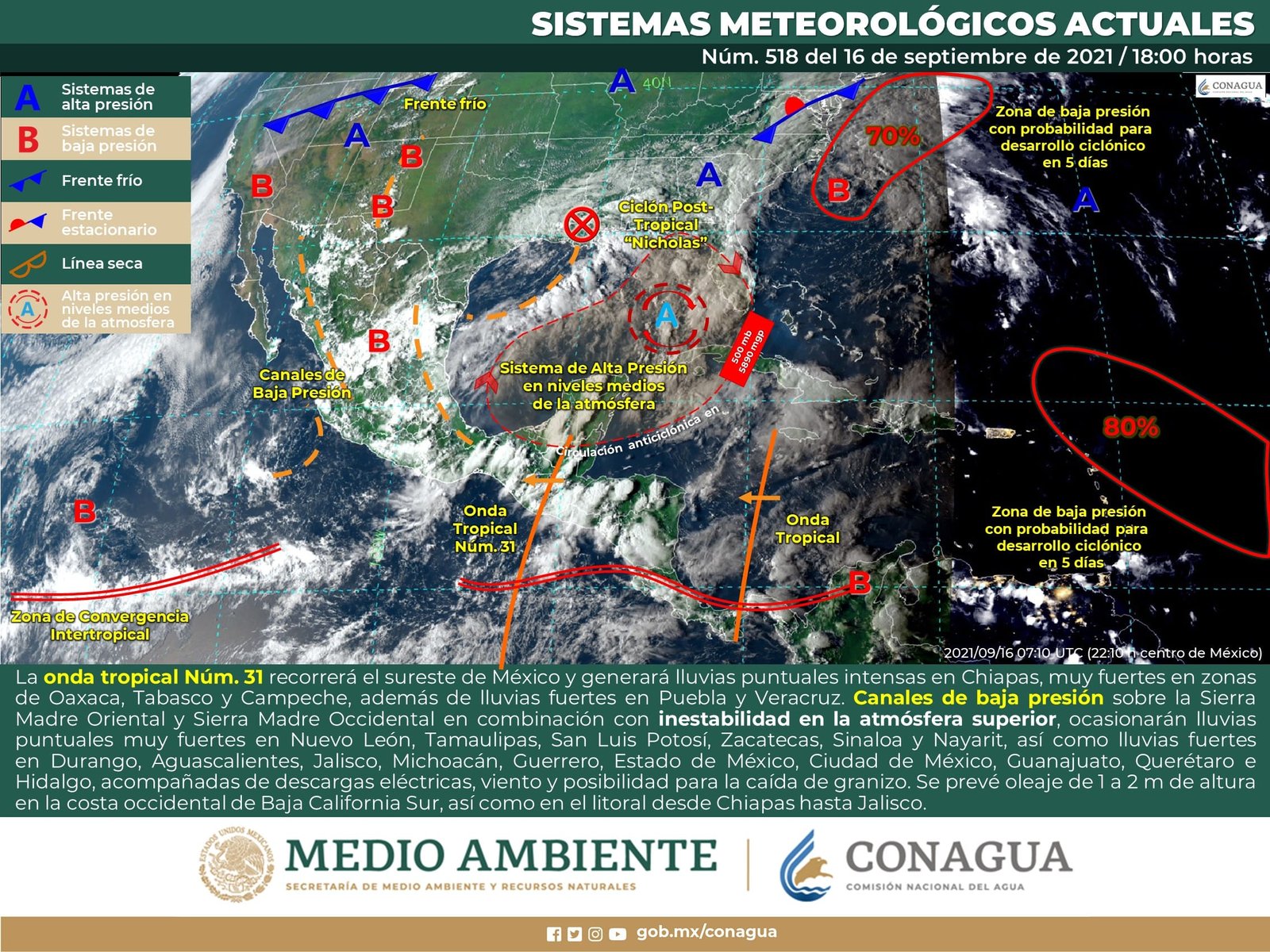 🔊 Escuchar esto Guanajuato continuará este viernes con alta probabilidad de lluvias nocturnas, debido a la presencia de dos canales de baja presión que además traerán nublados a partir de la tarde, dio a conocer el Servicio Meteorológico Nacional (SMN). De acuerdo con su último reporte, el organismo dependiente de la Comisión Nacional del Agua (Conagua) prevé que la Mesa Central del país tendrá cielo medio nublado por la mañana y nublado durante la tarde con lluvias muy fuertes en Guanajuato, fuertes en Querétaro, Morelos y Puebla, e intervalos de chubascos en Tlaxcala, todas con descargas eléctricas y posible caída de granizo. Habrá ambiente fresco con bancos de niebla dispersos por la mañana y temperaturas frías en zonas montañosas de Puebla y Tlaxcala, mientras que se esperan rachas de hasta 45 km/h en zonas de chubascos. LLUVIAS EN TODO GUANAJUATO El reporte indica que en todo Guanajuato se presentarán lluvias durante la noche con una humedad hasta de 85 por ciento a lo largo del país. Se esperan temperaturas máximas promedio de 24 grados a lo largo del día con rachas de viento a partir de la tarde. Las mínimas en el estado oscilarán entre los 13 y 14 grados durante la noche y madrugada del sábado. Los municipios que tienen la menor probabilidad de lluvia son los del noreste y con 50 por ciento. TORMENTAS EN EL CENTRO DEL PAÍS Para el resto del país, el SMN prevé que canales de baja presión sobre el norte, centro y sur del territorio nacional en interacción con inestabilidad en la atmósfera superior y los desprendimientos nubosos de la Zona de Convergencia Intertropical (ZCIT) ocasionarán chubascos y lluvias fuertes acompañadas de descargas eléctricas y posible caída de granizo en las regiones mencionadas, con lluvias muy fuertes a puntuales intensas en Guanajuato y Guerrero. ONDA TROPICAL EN EL SUR La onda tropical 31 recorrerá el sureste y oriente del país en combinación con un canal de baja presión en la Península de Yucatán, originarán chubascos y lluvias fuertes en las regiones mencionadas, con lluvias puntuales muy fuertes en Oaxaca y Chiapas. Prevalecerá el ambiente caluroso a muy caluroso sobre entidades del noroeste, norte y noreste de la República Mexicana, así como en la Península de Yucatán. Los sistemas meteorológicos ocasionarán este viernes: Lluvias muy fuertes con lluvias puntuales intensas (75 a 150 mm) en el estado de Guerrero (Costa Grande). Lluvias fuertes con lluvias puntuales muy fuertes (50 a 75 mm) en Guanajuato, Oaxaca y Chiapas. Intervalos de chubascos con lluvias puntuales fuertes (25 a 50 mm) en Tamaulipas, San Luis Potosí, Jalisco, Michoacán, Querétaro, Estado de México, Ciudad de México, Morelos, Puebla, Veracruz, Tabasco, Campeche y Yucatán. Intervalos de chubascos (5 a 25 mm) en Baja California Sur, Sonora, Chihuahua, Sinaloa, Durango, Nuevo León, Zacatecas, Aguascalientes, Nayarit, Colima, Hidalgo, Tlaxcala, y Quintana Roo. Posible caída de granizo en Jalisco, Michoacán, Guanajuato, Querétaro, Hidalgo, Estado de México, Tlaxcala y Puebla. Viento con rachas de 50 a 60 km/h en Baja California, Baja California Sur, Coahuila, Nuevo León, Campeche, Yucatán y Quintana Roo. Temperaturas máximas de 35 a 40 °C en Baja California, Sonora, Coahuila, Nuevo León, Tamaulipas, Campeche, Yucatán y Quintana Roo. Temperaturas mínimas para la madrugada del sábado de 0 a 5 °C y posibles heladas en zonas montañosas de Chihuahua, Durango, Estado de México, Tlaxcala y Puebla. Compartir