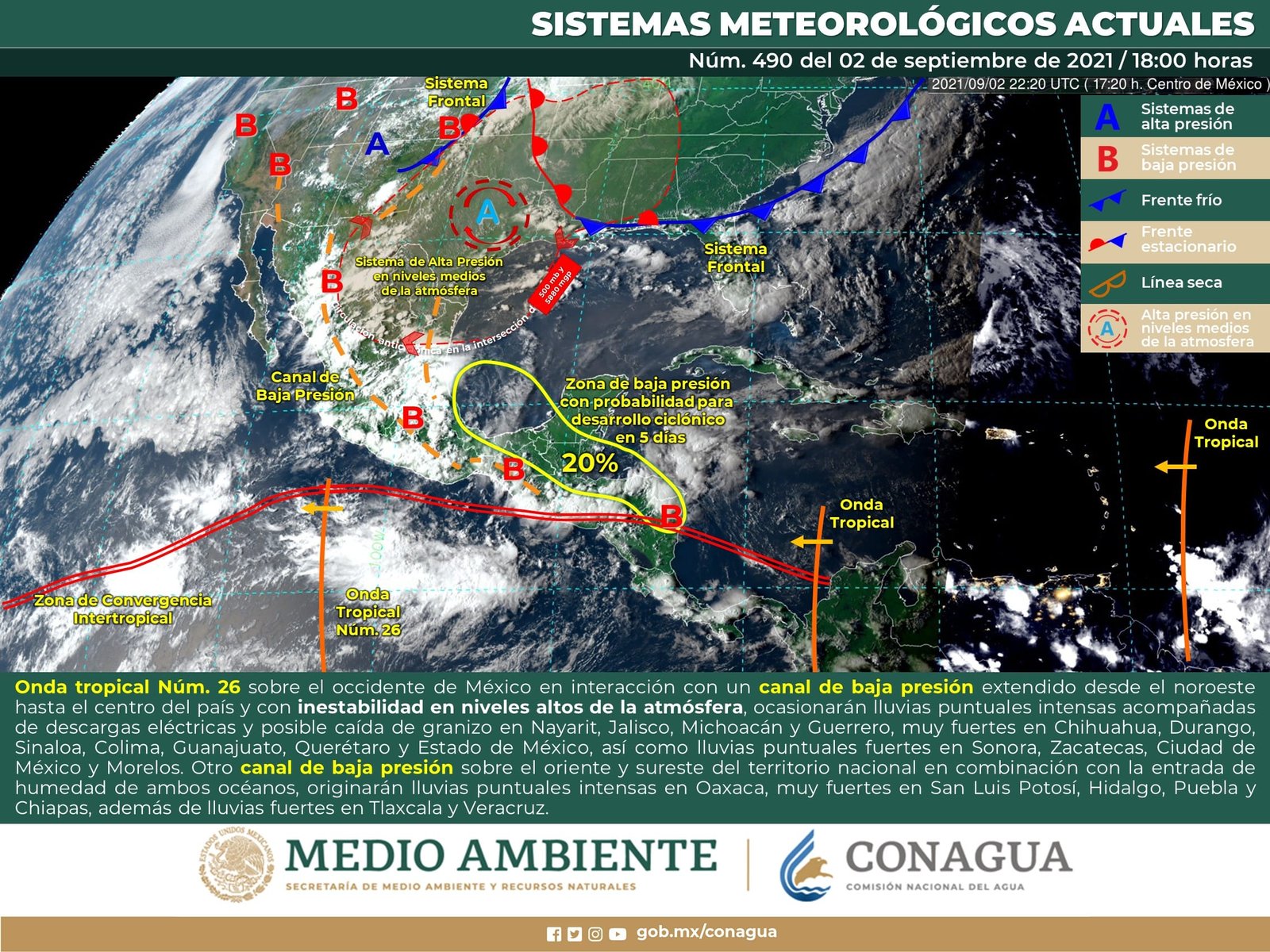 🔊 Escuchar esto Guanajuato continuará este viernes con alta probabilidad de lluvias nocturnas debido a la presencia de la onda tropical 26 y a un canal de baja presión que traerá nublados, dio a conocer el Servicio Meteorológico Nacional (SMN). De acuerdo con su último reporte, el organismo dependiente de la Comisión Nacional del Agua (Conagua) indicó que la Mesa Central del país registrará cielo nublado durante el día con ambiente fresco en la región, bancos de niebla por la mañana en zonas altas y temperaturas frías en zonas montañosas de Puebla y Tlaxcala. Ambiente cálido por la tarde con probabilidad de lluvias puntuales muy fuertes en Puebla y Guanajuato, así como fuertes en Querétaro, Hidalgo, Tlaxcala y Morelos. Se tendrá viento de dirección variable de 15 a 30 km/h acompañado de rachas de hasta 40 km/h. ALTA HUMEDAD EN GUANAJUATO El pronóstico indica que Guanajuato seguirá con elevada humedad y probabilidad de lluvia de 70 a 80 por ciento en la mayor parte de su territorio. Las temperaturas máximas promedio llegarán a 23 grados con intervalos de nublados a lo largo del día. Se espera que las tormentas inicien alrededor de las 19 horas, principalmente en la zona del corredor industrial. Las temperaturas mínimas promedio en el estado serán de 13 a 14 grados durante la noche y madrugada del sábado. SE JUNTAN FENÓMENOS EN EL CENTRO Para el resto del país, el SMN informó que un canal de baja presión se extenderá a lo largo de la Sierra Madre Occidental y el centro del país. Este fenómeno, en interacción con la onda tropical 26 que se desplazará sobre el occidente del territorio nacional, y una inestabilidad atmosférica superior y los desprendimientos nubosos de la Zona de convergencia Intertropical (ZCIT), producirán lluvias fuertes a muy fuertes acompañadas de descargas eléctricas y posible caída de granizo en estados del noroeste, occidente, centro y sur del país, con tormentas puntuales intensas en Sinaloa, Nayarit y Jalisco. CHUBASCOS EN EL ORIENTE Y SUR Segundo canal de baja presión se extenderá sobre el noreste, oriente y sureste del país, en combinación con la entrada de humedad del Golfo de México, ocasionará chubascos y lluvias puntuales fuertes en dichas regiones. NUEVA ONDA TROPICAL EN LA PENÍNSULA Una nueva onda tropical (27) se desplazará al sur de la Península de Yucatán y en interacción con un tercer canal de baja presión en la Sonda de Campeche propiciarán chubascos y lluvias fuertes en el sureste del territorio nacional. Los sistemas meteorológicos ocasionarán este viernes: Lluvias muy fuertes con lluvias puntuales intensas (75 a 150 mm) en Sinaloa, Nayarit y Jalisco. Lluvias fuertes con lluvias puntuales muy fuertes (50 a 75 mm) en Zacatecas, Aguascalientes, Estado de México, Guanajuato, Michoacán, Guerrero, Puebla, Veracruz y Oaxaca. Intervalos de chubascos con lluvias puntuales fuertes (25 a 50 mm) en Sonora, Chihuahua, Durango, Querétaro, Hidalgo, Tlaxcala, Ciudad de México, Morelos, Colima, Chiapas y Quintana Roo. Intervalos de chubascos (5 a 25 mm) en Coahuila, Nuevo León, Tamaulipas, San Luis Potosí, Tabasco, Campeche y Yucatán. Posible caída de granizo en Chihuahua, Sinaloa, Durango, Zacatecas, San Luis Potosí, Jalisco, Nayarit, Michoacán, Guanajuato, Querétaro, Hidalgo, Estado de México, Ciudad de México, Veracruz, Puebla y Tlaxcala. Viento con rachas de 50 a 60 km/h en Chihuahua, Coahuila, Nuevo León, Tamaulipas, Durango, Zacatecas, San Luis Potosí, Campeche, Yucatán y Quintana Roo. Temperaturas máximas de 40 a 44 °C en Baja California. Temperaturas máximas de 35 a 40 °C en Sonora, Chihuahua, Coahuila, Nuevo León, Tamaulipas, Chiapas, Tabasco, Campeche, Yucatán y Quintana Roo. Temperaturas mínimas para la madrugada del sábado de 0 a 5 °C y posibles heladas en zonas montañosas de Estado de México, Tlaxcala y Puebla. Compartir