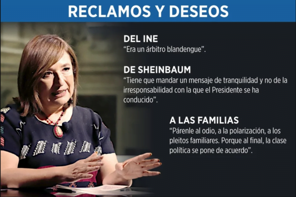 En una amplia entrevista, tras su derrota del 2 de junio, Xóchitl Gálvez resume que la derrota de la coalición opositora frente a la morenista Claudia Sheinbaum fue las inexistentes estructuras de los partidos políticos ante la espontánea movilización ciudadana. En charla con el director del diario Reforma, Roberto Zamarripa, Gálvez Ruiz dijo que esta nula estructura contrastó con la movilización ciudadana que era real y muy importante. “Me di cuenta que en los estados no se ha hecho un trabajo partidista de la dimensión que Morena estaba haciendo. Se ha abandonado mucho el trabajo territorial”, indicó la hidalguense. “Por ejemplo, yo cuando visité Oaxaca, Chiapas, Tabasco, Campeche, pues me di cuenta de la poca estructura que había de los tres partidos (PAN, PRI y PRD). “La ciudadanía jugó un papel muy importante. Por eso estoy súper agradecida con los ciudadanos. Porque hubo ciudadanos que hicieron sus camisetas, hicieron sus estampas, hicieron su publicidad”, dijo. MANOS ATADAS De hecho, la ex candidata describe una batalla con las manos atadas, pues admite que nunca pudo decidir candidaturas de legisladores ni de gobernadores. Tampoco decidió la disposición del dinero para la campaña. No llevaba mano en el mensaje central de la campaña. Tampoco conoció datos reales de encuestas. “El dinero que había era de los partidos políticos. Poco dinero para la magnitud de cubrir un país. El partido (PAN) nos dijo ‘ya contraté tantos espectaculares’. Cuando cuestionamos nos dijeron ‘es que lo hice desde hace seis meses’”, añade. “La publicidad fue muy difícil que llegara. Todo lo hace el partido. La campaña de nosotros no tenía recursos para decir ‘manden a hacer dos millones de playeras’, o queremos esto o los spots de televisión”. EL INSOLENTE MARKO CORTÉS La senadora acusa que el presidente nacional del PAN, Marko Cortés, no sólo limitó los recursos sino que fue insolente, agresivo, cuando ella decidió admitir los resultados desfavorables y llamarle a Sheinbaum para felicitarla. Relata el incidente en el piso 42 de un hotel de Polanco donde tenía su cuarto de guerra el equipo de campaña. “A las 7 de la noche me dicen que efectivamente ganamos la Ciudad (de México), que ganamos Veracruz, Puebla, Yucatán, Guanajuato, Morelos. “Decían que había evidencia o había proyecciones, porque la palabra proyecciones fue algo que surgió el domingo. Que las proyecciones eran positivas y que estábamos ganando estas ciudades”. GOLPE BRUTAL “En el momento que sale el conteo rápido, que es brutal, que es contundente yo tomo la decisión de marcarle. Le pido a Max (Cortázar) que me comunique con Claudia Sheinbaum, porque a mí me parece que en una democracia es tu deber reconocer tu derrota. O sea, es lo ético, es lo que debe de hacer un demócrata”, narró a Reforma. Sheinbaum revela en su aparición tras los datos revelados por el INE, que había recibido la llamada de Gálvez. Eso enerva a Marko Cortés, quien acudió al piso 42 a encarar a la candidata. Gálvez estaba redactando su discurso de aceptación de la derrota y dijo que el líder panista le gritó reiteradamente. “Marko pide que se quite la parte de felicitar, y se arma ahí un debate fuerte. Muchos hombres, al igual que el presidente (AMLO), tienen que aprender a manejar su masculinidad. Muchos hombres creen que gritando, ofendiendo a las mujeres, resuelven los problemas”, subrayó en la entrevista. “Los hombres tienen que entender que las mujeres ejercemos la política de una manera distinta, y en mí lo correcto era felicitar a Claudia. O sea, no lo dudé”. Reiteró su acusación de la grave inequidad de la elección, “pero de que estaban los votos. Esa noche estaban los votos”. MENSAJE DE RECONCILIACIÓN Gálvez finalmente externó un mensaje de reconciliación frente a un país que, dice, está en duelo. “Sé que la gente está desconcertada, está deprimida… Sí hay un duelo en el país porque creen que nos va a ir muy mal. Y sí, nos puede ir muy mal, si no se toman buenas decisiones”, apunta. “Hago votos porque la presidenta electa tome buenas decisiones por el país. Y yo diría a las familias: párenle al odio, párenle a la polarización, párenle a los pleitos familiares. Porque al final, la clase política se pone de acuerdo”, remató. (Fotos: Tomadas del Reforma) Compartir Navegación de entradas Viva Aerobus abre nueva ruta desde el Bajío al AIFA Adelanta que este viernes dará avances sobre el multihomicidio