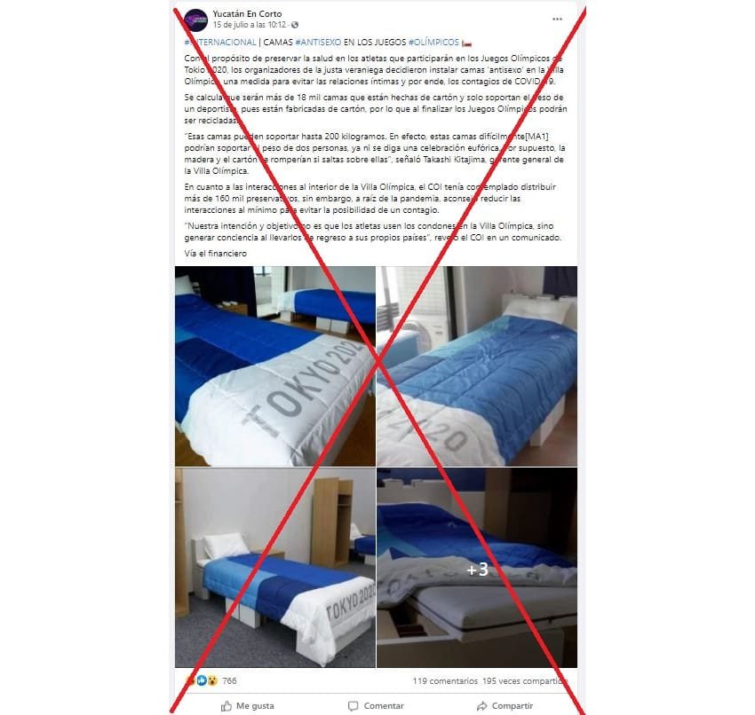 🔊 Escuchar esto Todo fue falso. Las camas sí son resistentes. Y es que desde el 14 de julio pasado han sido compartidas cientos de veces publicaciones en redes sociales sobre las supuestas “camas anti-sexo” hechas de cartón en la Villa Olímpica. Estas supuestas camas “anti-sexo” estaban destinadas, según se compartió, para evitar contagios de Covid-19 durante los Juegos Olímpicos de Tokio 2020. Sin embargo, las camas fueron presentadas meses antes de la detección del virus y soportan unos 200 kilos, según su fabricante y varios atletas demostraron su resistencia, señala la agencia AFP. “Con el propósito de preservar la salud en los atletas que participarán en los Juegos Olímpicos de Tokio 2020, los organizadores de la justa veraniega decidieron instalar camas “anti-sexo” en la Villa Olímpica, una medida para evitar las relaciones íntimas y por ende, los contagios de Covid-19”, decía una de las publicaciones en Facebook y Twitter sobre las camas. LA HISTORIA Hasta el 8 de agosto, Tokio es sede de los Juegos Olímpicos con ausencia de público por la pandemia de Covid-19, la cual causó que la justa deportiva se pospusiera un año. Estas camas fueron presentadas desde en septiembre de 2019, mientras que el virus causante del Covid-19 fue identificado en diciembre de ese año, en China. Por lo tanto, su diseño de cartón no pudo haberse destinado a evitar contagios entre quienes concurrieran a los Juegos Olímpicos. El uso de este material reciclable en la fabricación de las camas se debe al deseo de organizar un evento sustentable, dijo a la AFP Takashi Kitajima, gerente general de la Villa Olímpica en enero de 2020. Preferimos no destruir las cosas que construimos, sino continuar usándolas. Esto es fundamental para ofrecer sustentabilidad”, dijo. Un representante de Airweave, la empresa que fabricó las camas, dijo a la AFP que aguantan hasta 200 kilos: “Hemos realizado pruebas, como lanzar peso en las camas. (…) Mientras haya solo dos personas en la cama, deberían ser lo suficientemente sólidas para soportar la carga”. PRUEBA SUPERADA Algunos atletas incluso ya probaron las camas. El gimnasta irlandés Rhys McClenaghan publicó un video en Twitter en el que salta sobre la cama, demostrando su resistencia y responde a los rumores sobre la fragilidad de las estructuras: “Eso no es cierto, son noticias falsas”. Christian Klaue, director de Comunicaciones Corporativas y Relaciones Públicas del Comité Olímpico Internacional (COI), compartió el video del atleta y dijo: “El @iocmedia recibe muchas preguntas sobre las camas de cartón sustentables de la Villa Olímpica. @McClenaghanRhys las puso a prueba. Aquí vamos”. En el mismo sentido, el jugador de voleibol Douglas Souza, de la selección brasileña, también compartió un video en el que aparece bailando samba sobre una de las camas de cartón. (Foto: Tomada de la agencia AFP) Compartir
