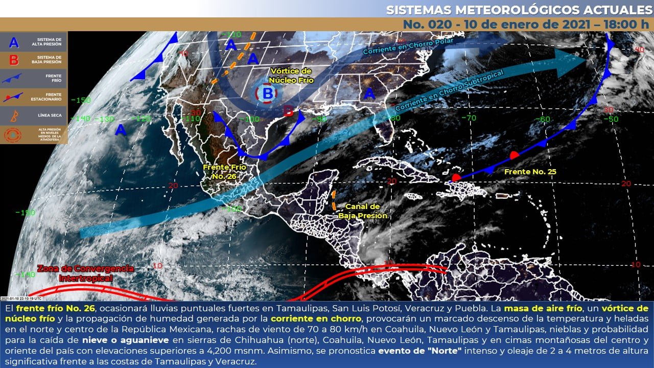 🔊 Escuchar esto Guanajuato continuará este lunes con temperaturas muy bajas durante la madrugada y noche e incluso algunas zonas tendrán un grado, dio a conocer el Servicio Meteorológico Nacional (SMN). De acuerdo con su último reporte, el organismo dependiente de la Conagua pronosticó que para la Mesa Central del país se presente cielo nublado por la tarde con lluvias puntuales fuertes solo en Puebla, intervalos de chubascos en Morelos y Tlaxcala, así como lluvias aisladas en Querétaro e Hidalgo. Seguirá el ambiente muy frío con bancos de niebla en zonas serranas y posibilidad de caída de nieve o aguanieve en sierras con alturas superiores a 4,200 msnm de Puebla y Estado de México. También seguirán las rachas de viento, principalmente en Hidalgo y Puebla. HELADAS EN GUANAJUATO Para Guanajuato, el reporte indica que municipios como San Felipe, San Luis de la Paz, Victoria, Doctor Mora, San José Iturbide y Tierra Blanca tendrán mínimas de 1 y grados y máximas de apenas 16 grados. Los municipios de León, Irapuato, Salamanca, Celaya, Dolores Hidalgo, Guanajuato capital y León tendrán algunos nublados y máximas promedio de 22 grados durante el día. Las mínimas en estas demarcaciones promediarán entre 5 y 6 grados, añadió el reporte. FRENTE FRÍO EN EL NORTE Y ORIENTE Para el resto del país, el SMN dijo que el intenso frente frío No. 26 se extenderá desde el norte del Golfo de México hasta el oriente y norte de la República Mexicana. Al mismo tiempo, una vaguada prefrontal recorrerá el sureste del país ocasionando lluvias fuertes a puntuales intensas sobre dicha región, incluyendo a la Península de Yucatán. La masa de aire polar, asociada al frente, en interacción con un vórtice de núcleo frío, con un fuerte pulso de la corriente en chorro polar y con la corriente en chorro subtropical ocasionarán un marcado descenso de las temperaturas diurnas sobre gran parte de, país. Se esperan fuertes rachas de viento con posibles tolvaneras sobre entidades del noroeste, norte, noreste y centro de México. POTENCIAL DE NIEVE Además, se espera potencial para la caída de nieve o aguanieve en zonas serranas de Chihuahua, Coahuila y Nuevo León, así como en cimas montañosas del centro y oriente del país con elevaciones superiores a 4,500 metros. A su vez, se prevé evento de “Norte” de muy fuerte a intenso en el litoral del Golfo de México e Istmo y Golfo de Tehuantepec y posible formación de trombas marinas en las costas de Quintana Roo. Los sistemas meteorológicos ocasionarán este lunes: Lluvias muy fuertes a puntuales intensas (75 a 150 mm) acompañadas de descargas eléctricas y rachas fuertes de viento durante las tormentas en Tabasco, Chiapas (norte), Campeche, Yucatán y Quintana Roo. Lluvias fuertes a puntuales muy fuertes (50 a 75 mm) acompañadas de descargas eléctricas y rachas fuertes de viento durante las tormentas en Veracruz (sur) y Oaxaca (oriente). Intervalos de chubascos con lluvias puntuales fuertes (25 a 50 mm) acompañadas de descargas eléctricas y rachas fuertes de viento durante las tormentas en Puebla. Intervalos de chubascos (5.1 a 25 mm) acompañados descargas eléctricas y rachas fuertes de viento en el Estado de México, Morelos, Tlaxcala y Guerrero Lluvias aisladas (0.1 a 5.0 mm) en Chihuahua, Coahuila, Nuevo León, Tamaulipas, San Luis Potosí, Michoacán, Querétaro, Hidalgo y Ciudad de México. Posible formación de trombas marinas en costas de Quintana Roo. Posible caída de nieve o aguanieve en las sierras de Chihuahua, Coahuila y Nuevo León, así como en cimas montañosas del centro y oriente del país con elevaciones superiores a 4,500 metros. Evento de “Norte” con rachas de 80 a 100 km/h en el litoral de Veracruz e Istmo y Golfo de Tehuantepec, rachas de 70 a 80 km/h en el litoral de Tamaulipas y con rachas de 60 a 70 km/h en el litoral de Tabasco y Campeche. Viento con rachas de 50 a 60 km/h en el Mar de Cortés, Baja California, Baja California Sur, Nuevo León, Estado de México, Ciudad de México, Hidalgo y Puebla. Oleaje de 3 a 5 metros de altura significante en el litoral de Veracruz y Golfo de Tehuantepec, y oleaje de 2 a 3 metros de altura en el litoral de Tamaulipas, Tabasco y Campeche. Temperaturas mínimas para la madrugada del martes de -15 a -10°C con heladas en zonas montañosas de Sonora, Chihuahua y Durango. Temperaturas mínimas para la madrugada del martes de -10 a -5°C con heladas en zonas montañosas de Baja California, Coahuila, Nuevo León y Zacatecas. Temperaturas mínimas para la madrugada del martes de -5 a 0°C con heladas en zonas montañosas de Tamaulipas, San Luis Potosí (occidente), Jalisco (norte), Aguascalientes (norte), Guanajuato, Hidalgo, Estado de México, Puebla y Tlaxcala. Temperaturas mínimas para la madrugada del martes de 0 a 5°C y posibles heladas en zonas montañosas de Michoacán, Querétaro, Ciudad de México, Morelos, Veracruz y Oaxaca (occidente). Compartir