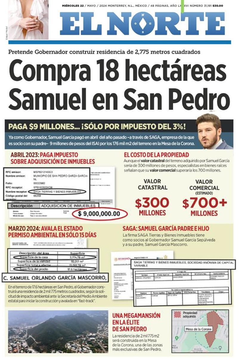 El gobernador de Nuevo León, Samuel García, acaba de darse un nuevo “regalito”. El diario Reforma exhibió que, 18 meses después de haber asumido el cargo, García adquirió un predio de 17.6 hectáreas en una de las zonas más exclusivas en San Pedro denominada Mesa de la Corona. El valor comercial estimado del “terrenito” es de más de 700 millones de pesos, reportó Reforma. En ese predio, el mandatario pretende construir una residencia de casi 2 mil 800 metros cuadrados y está a nombre de SAGA Tierras y Bienes Inmuebles, empresa encabezada por el mandatario de Movimiento Ciudadano y su padre, Samuel García Mascorro. Documentación en poder de Reforma muestra que el 18 de abril del 2023 la empresa del gobernador pagó el Impuesto Sobre Adquisición de Inmuebles (ISAI) ante el municipio de San Pedro por 9 millones de pesos. FUE UNA “GANGA” De acuerdo con la ley, este impuesto se paga al realizar la compra de una propiedad y equivale al 3 por ciento del valor catastral del inmueble adquirido, por lo que el terreno de García de 176 mil metros cuadrados tiene un valor catastral de al menos 300 millones de pesos. Sin embargo, especialistas en bienes raíces consultados señalaron que un inmueble de esa dimensión en esa zona élite de San Pedro tendría un costo comercial superior a los 700 millones de pesos. Apenas el pasado 4 de marzo, García Mascorro, padre del gobernador, como representante legal de SAGA Tierras y Bienes Inmuebles, presentó ante la Secretaría del Medio Ambiente del Estado una solicitud en materia de impacto ambiental para poder iniciar con la construcción de la mansión. MANSIÓN A LA VISTA Esta solicitud, aprobada y de la cual tiene copia Reforma, detalla que el proyecto que García pretende realizar abarca una megacasa de 2 mil 775 metros cuadrados y la construcción de una vialidad de 10 mil 317 metros cuadrados. La superficie total a impactar asciende a 13 mil 091.78 metros cuadrados, según el documento oficial. La autorización para el impacto ambiental en el inmueble le fue dada por el Estado al gobernador en “fast-track”, en un plazo de 15 días naturales, cuando este trámite puede tardar hasta 90 días naturales, de acuerdo con la ley. Fuentes consultadas por Reforma confirmaron que la empresa de García y su padre ya presentó la solicitud ante el municipio de San Pedro para el permiso de construcción de la residencia en el terreno adquirido, pero -hasta donde se sabe- no se le ha otorgado. En la declaración patrimonial del año pasado, la más reciente publicada, el gobernador no reportó esta propiedad. (Fotos: Tomadas de Reforma) Compartir Navegación de entradas Operan desde Sinaloa guerra sucia contra Libia Dennise Plantea Ale Gutiérrez 60 soluciones para el futuro de León