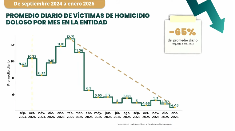 • Descenso drástico: El promedio diario de homicidios en el estado cayó un 65%, pasando de 12.71 a 4.45 casos al día en el periodo de septiembre 2024 a enero 2026.