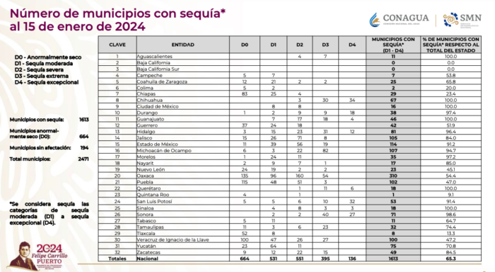 Ninguno de los 46 municipios de Guanajuato está a salvo. El último reporte del Monitor Nacional de Sequía mostró que todos los municipios del estado están en sequía. Los niveles de sequía se han vuelto alarmantes en la entidad, señala el monitoreo realizado hasta el 15 de enero pasado. Elaborado por la Comisión Nacional del Agua (Conagua), el monitor muestra que todas las demarcaciones de Guanajuato presentan desde sequía moderada hasta sequía excepcional. 6 ESTADOS EN SITUACIÓN GRAVE Guanajuato es uno de los seis estados del país que tienen a todos sus municipios con índices alarmantes de sequía. Las entidades son: Aguascalientes Chihuahua Ciudad de México Guanajuato Querétaro Sinaloa El reporte indica que, en total, son mil 613 municipios del país los que se encuentran bajo sequía, por lo que la temporada de calor será sumamente complicada por la escasez de agua. Solo 194 municipios de todo el país se encuentran sin afectaciones, la mayoría ubicados en las Bajas Californias y Quintana Roo. Compartir Navegación de entradas Refuerzan en Guanajuato plan contra el dengue Atrajo Guanajuato 49 inversiones automotrices en 2023