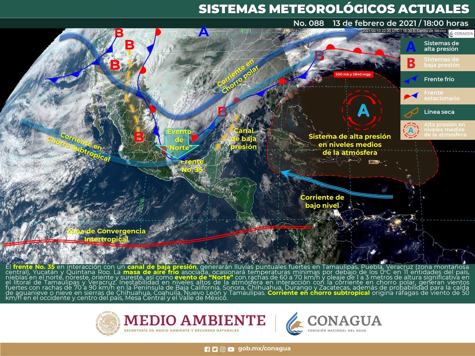 🔊 Escuchar esto Este domingo, Guanajuato seguirá con muy bajas temperaturas y algunos municipios marcarán un grado durante la madrugada, dio a conocer el Servicio Meteorológico Nacional (SMN). De acuerdo con su último reporte, el organismo dependiente de la Conagua pronostica que el país seguirá afectado por el frente frío y la Mesa Central tendrá cielo parcialmente nublado con muy baja probabilidad de lluvia. Continuará el ambiente muy frío y heladas matutinas en zonas altas y ambiente templado por la tarde. Se espera viento del suroeste de 15 a 30 km/h con rachas de 50 a 60 km/h en Guanajuato, Querétaro, Hidalgo, Tlaxcala y Puebla. HELADAS NOCTURNAS EN GUANAJUATO El reporte indica que los municipios de León, Guanajuato capital, Comonfort, Dolores Hidalgo, Celaya, Salamanca e Irapuato tendrán máximas de 26 grados con cielos despejados y fuertes rachas de viento vespertinas. No se esperan lluvias. Las mínimas en estas demarcaciones oscilarán entre los 1 y 3 grados durante la madrugada y noche, añadió el reporte. SE FRENTE FRÍO 35 Para el resto del país, el SMN dijo que durante la mañana del domingo, el frente No. 35 se extenderá como estacionario y en proceso de disipación sobre el norte, oriente, centro y sureste del territorio nacional. Sin embargo, se pronostican chubascos y lluvias fuertes sobre el noreste, oriente y sureste del país. A su vez, la masa de aire frío asociada se desplazará hacia el oriente, ocasionando el gradual debilitamiento del evento de “Norte” en el litoral de Tamaulipas y Veracruz. PERO VIENE OTRO En el transcurso del día, se prevé el ingreso de un nuevo frente frío y una nueva masa de aire polar ártica que darán origen a la novena tormenta invernal. Esta tormenta ocasionará lluvias fuertes, vientos intensos y ambiente gélido sobre los estados del noroeste, norte y noreste de México, así como la probable caída de aguanieve o nieve en zonas de montañosas de Sonora, Chihuahua, Durango, Coahuila, Nuevo León y Tamaulipas. DETECTAN EVENTO NORTE A su vez, durante la madrugada del lunes se prevé un nuevo evento de “Norte” en el litoral de Tamaulipas y norte de Veracruz, además de un nuevo descenso de las temperaturas sobre el oriente, centro y sureste del país, con presencia de heladas matutinas en las zonas altas de la Mesa del Norte y la Mesa Central. Corriente en chorro subtropical ocasionará vientos fuertes con tolvaneras sobre entidades del occidente y centro del territorio nacional. Los fenómenos meteorológicos mencionados causarán este domingo: Intervalos de chubascos con lluvias puntuales fuertes (25 a 50 mm) acompañadas de descargas eléctricas, rachas fuertes de viento y posible caída de granizo en los estados de Sonora, Chihuahua y Coahuila. Intervalos de chubascos (5.1 a 25 mm) acompañados de descargas eléctricas, rachas fuertes de viento y posible caída de granizo en Sinaloa, Durango, Veracruz, Tamaulipas, Oaxaca, Yucatán y Quintana Roo. Lluvias aisladas (0.1 a 5.0 mm) en Nuevo León, San Luis Potosí, Chiapas, Campeche y Tabasco. Posible caída de aguanieve o nieve en sierras de Sonora, Chihuahua, Durango, Coahuila, Nuevo León y Tamaulipas. Evento de “Norte” con rachas de 60 a 80 km/h durante la madrugada del lunes en el litoral de Tamaulipas y norte de Veracruz. Viento con rachas de 100 a 120 km/h y tolvaneras en Chihuahua y Durango. Viento con rachas de 70 a 90 km/h y tolvaneras en Coahuila, Nuevo León y Tamaulipas. Viento con rachas de 60 a 70 km/h en el Golfo de California y con tolvaneras en Baja California, Baja California Sur, Sonora, Zacatecas y San Luis Potosí. Viento con rachas de 50 a 60 km/h en Aguascalientes, Jalisco, Guanajuato, Querétaro, Hidalgo, Estado de México, Ciudad de México, Tlaxcala, Puebla, Veracruz y Oaxaca. Temperaturas máximas de 35 a 40°C en Michoacán, Morelos, Guerrero, Oaxaca, Chiapas, Tabasco, Campeche, Yucatán y Quintana Roo. Temperaturas mínimas para la madrugada del lunes de -15 a -10°C con heladas en zonas de Sonora, Chihuahua, Coahuila y Durango. Temperaturas mínimas para la madrugada del lunes de -10 a -5°C con heladas en zonas de Nuevo León, Tamaulipas, Zacatecas y Aguascalientes. Temperaturas mínimas para la madrugada del lunes de -5 a 0°C con heladas en zonas de San Luis Potosí, Jalisco (norte), Hidalgo, Tlaxcala, Puebla, Guanajuato y Estado de México. Temperaturas mínimas para la madrugada del lunes de 0 a 5°C y posibles heladas en zonas de Baja California, Querétaro, Michoacán, Ciudad de México, Morelos, Veracruz y Oaxaca. Compartir